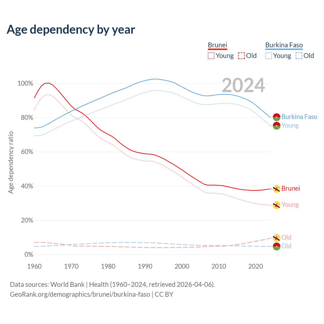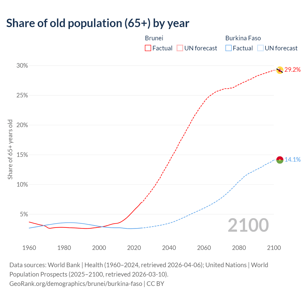 - The share of old-age demographic (65+) in Brunei is 6.87% vs 2.65% in Burkina Faso.