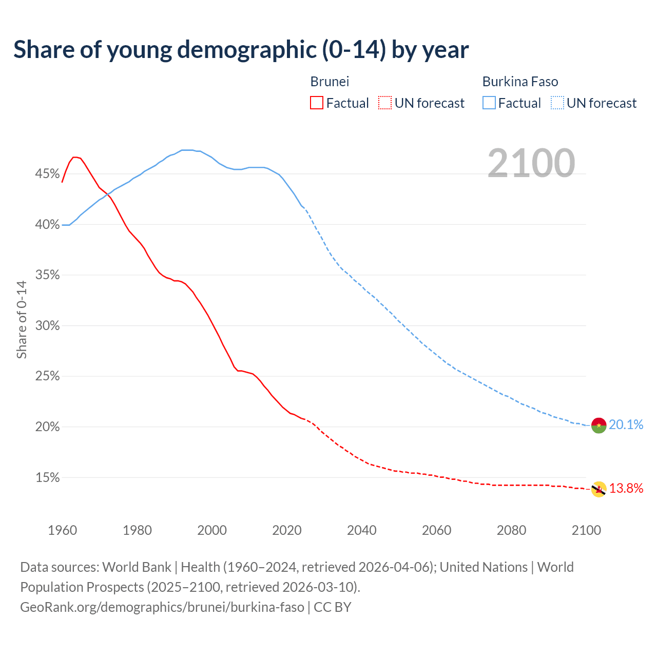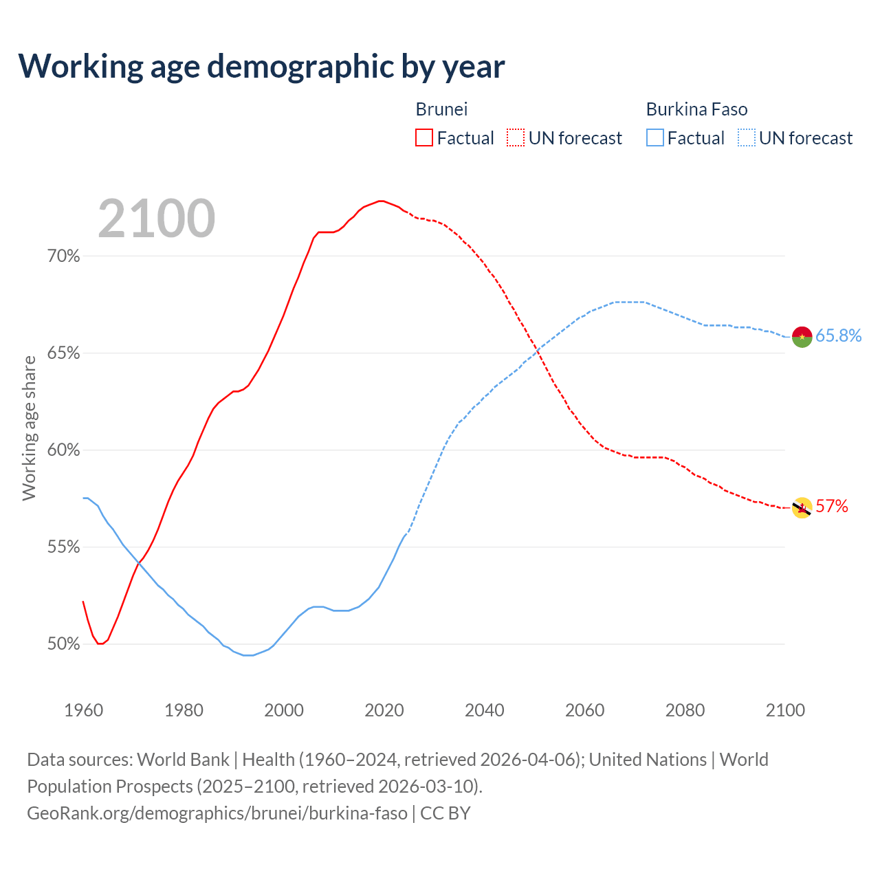 Median age Brunei vs Burkina Faso, 1960-2100