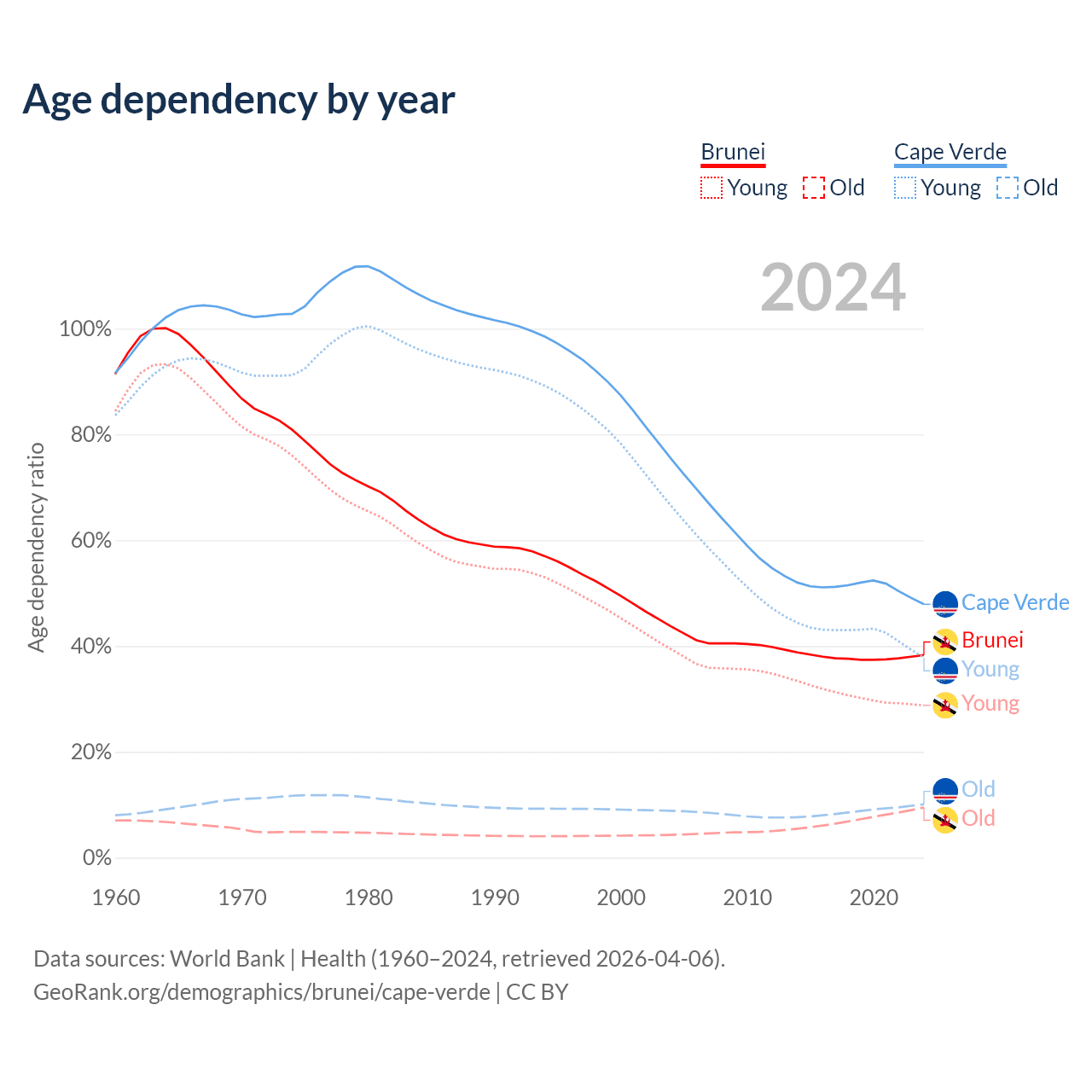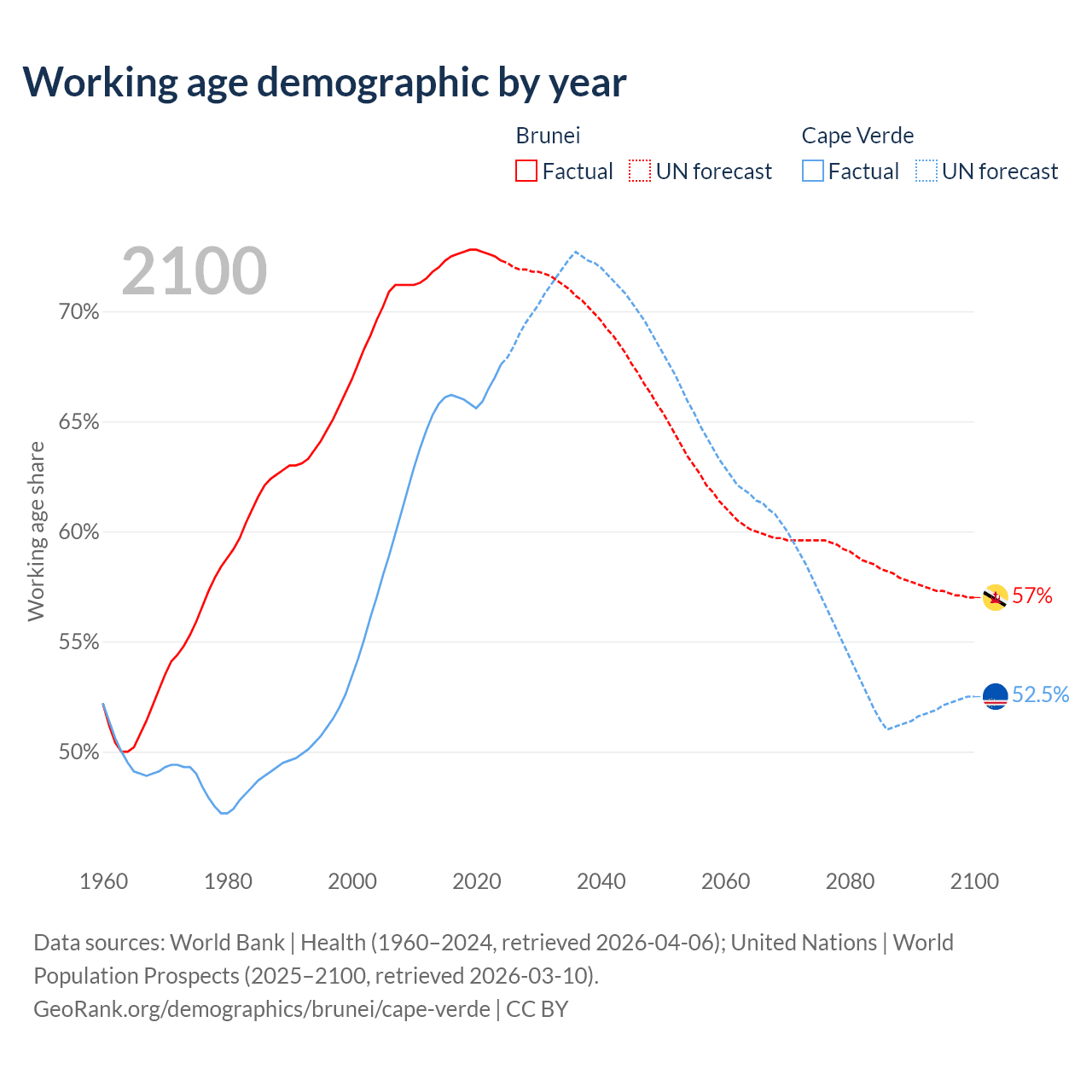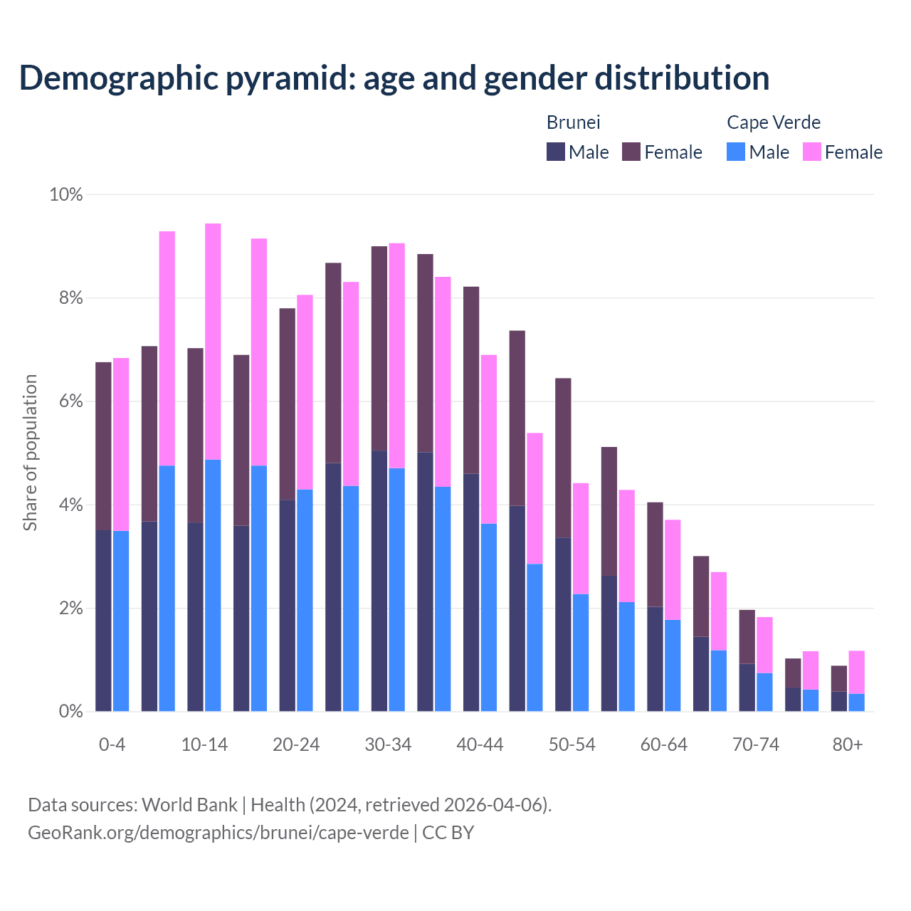 - The share of young demographic (0-15 years old) in Brunei is 20.8% vs 25.5% in Cape Verde.