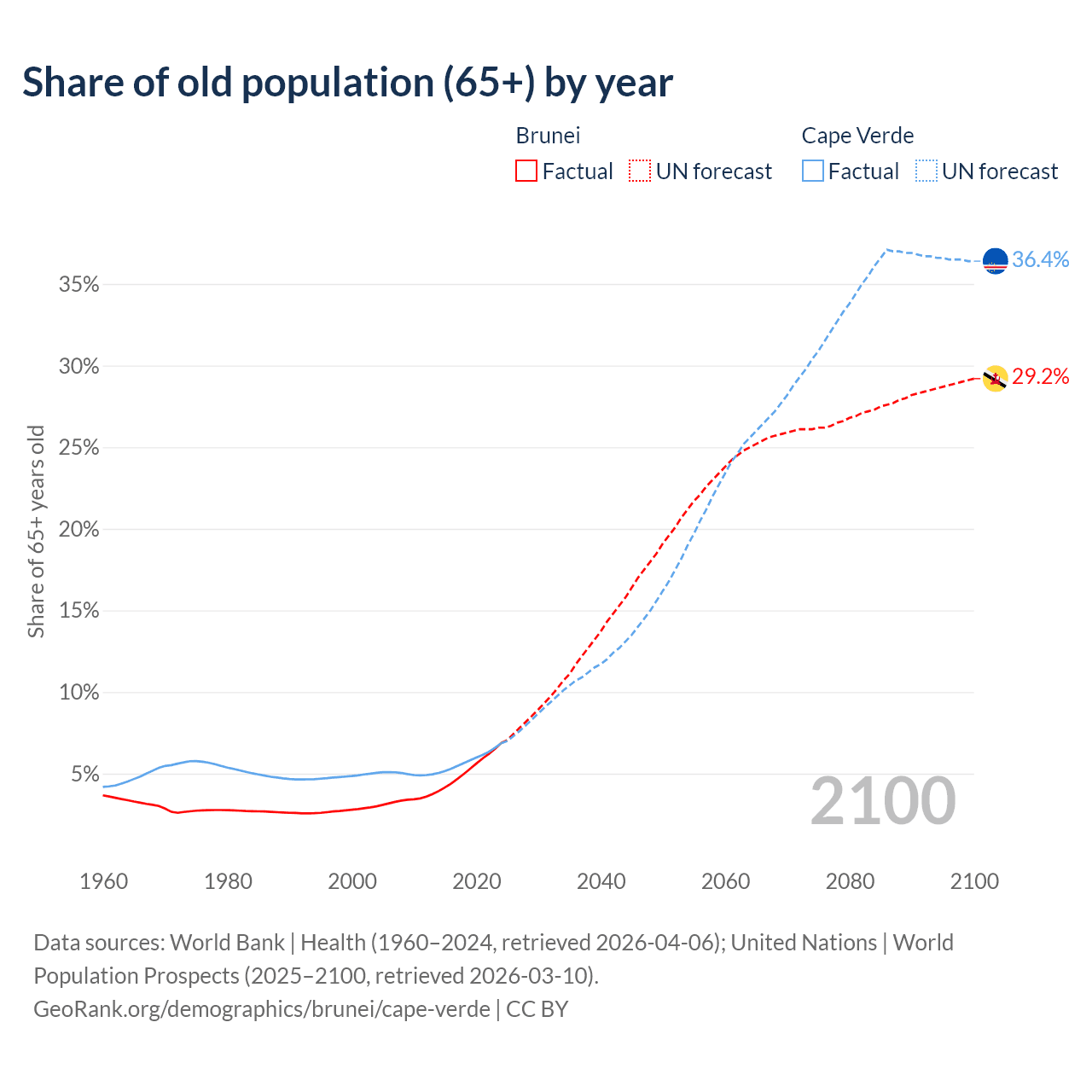 - The share of old-age demographic (65+) in Brunei is 6.87% vs 6.86% in Cape Verde.