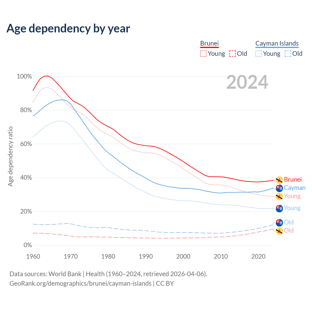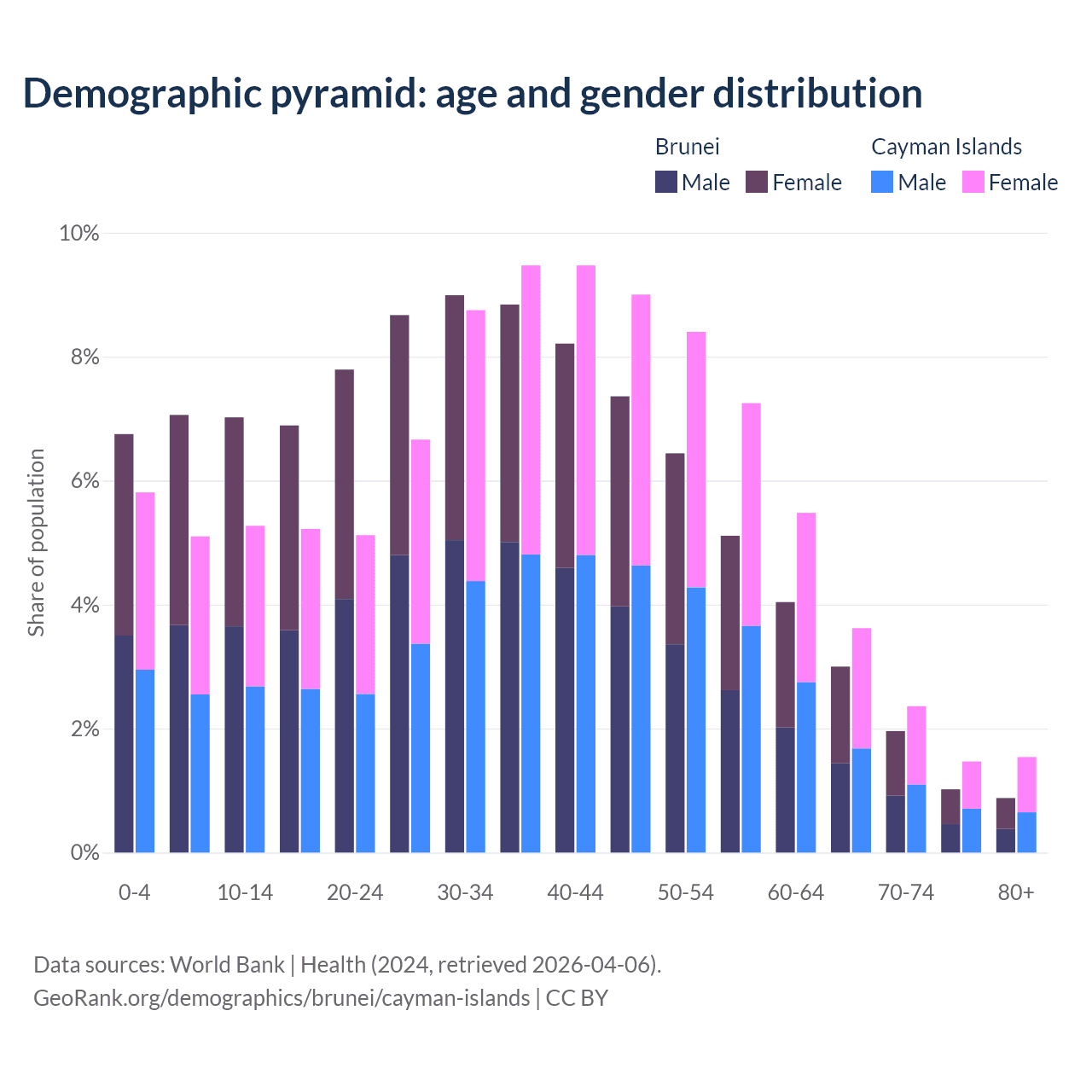 - Brunei is ranked 88/196 by median age (oldest to youngest) vs 51/196 for the Cayman Islands.