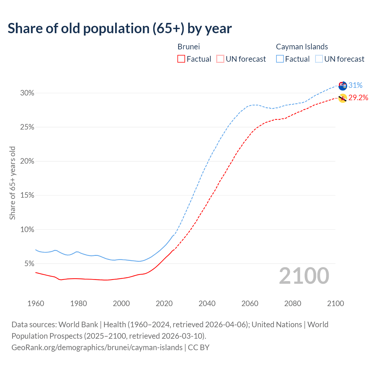 The share of older people aged 65 and over is 6.87% in Brunei and 9% in the Cayman Islands. Life expectancy in Brunei compared to the Cayman Islands .