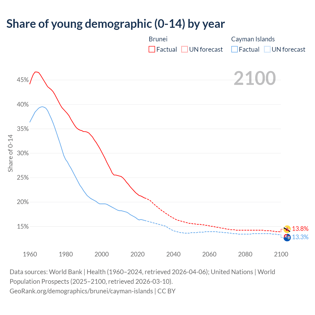 - The share of young demographic (0-15 years old) in Brunei is 20.8% vs 16.2% in the Cayman Islands.