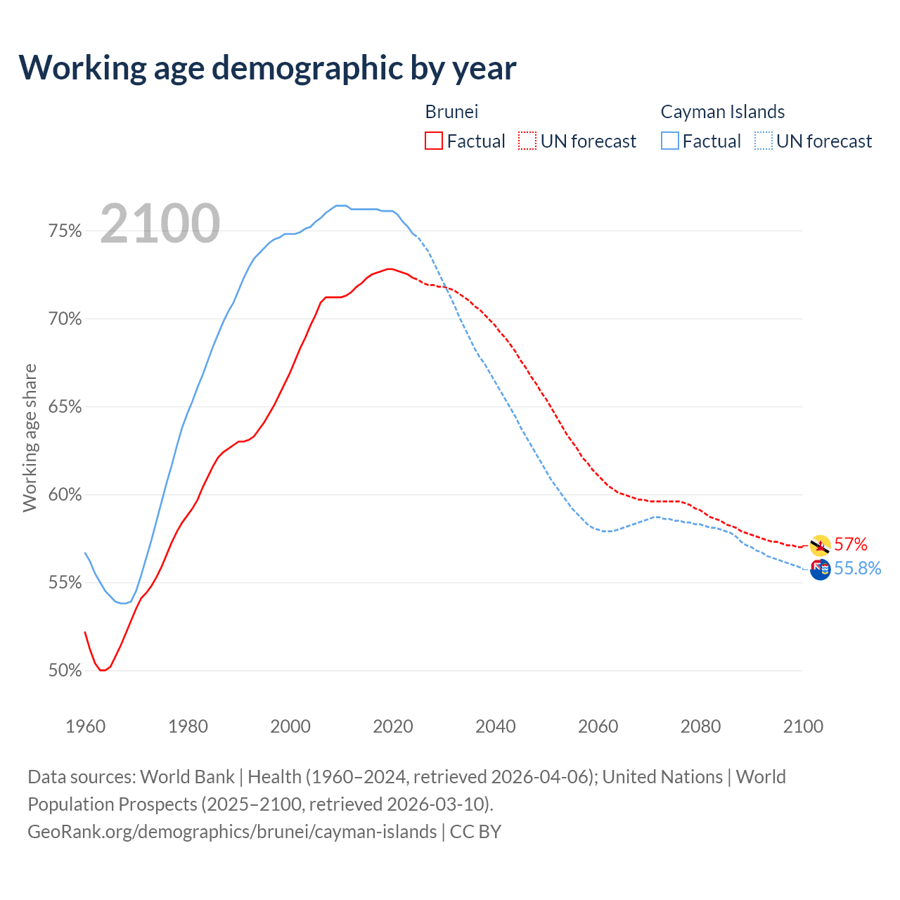 - Brunei has 340K working age adults (aged 15-64) vs 58.1K in the Cayman Islands.