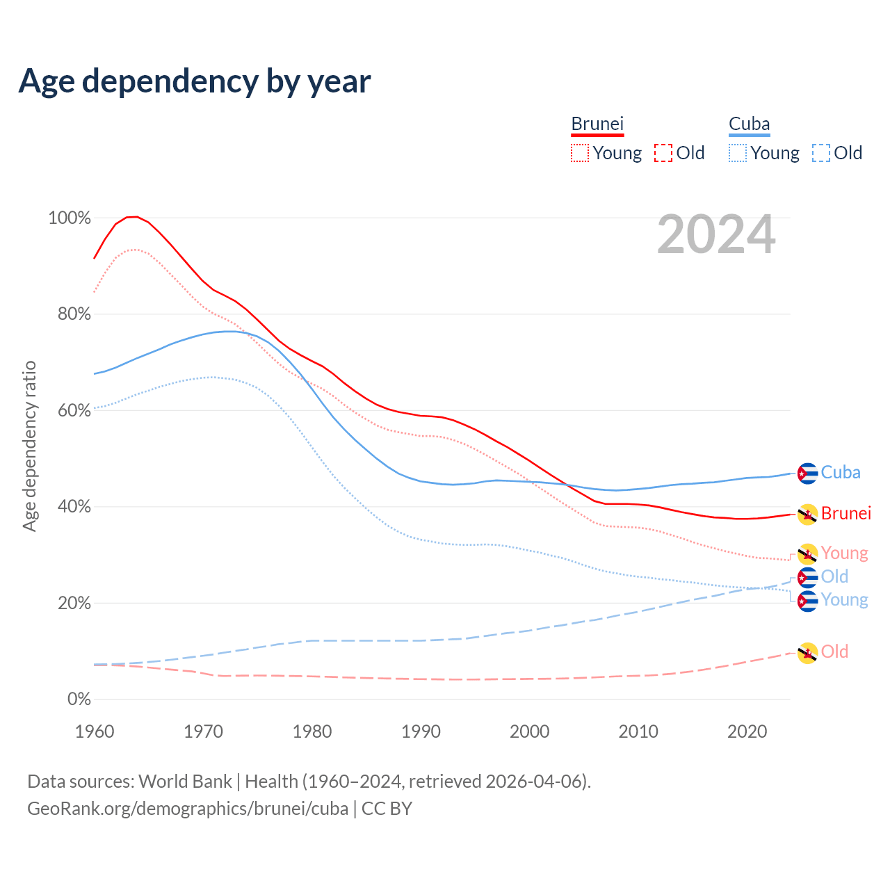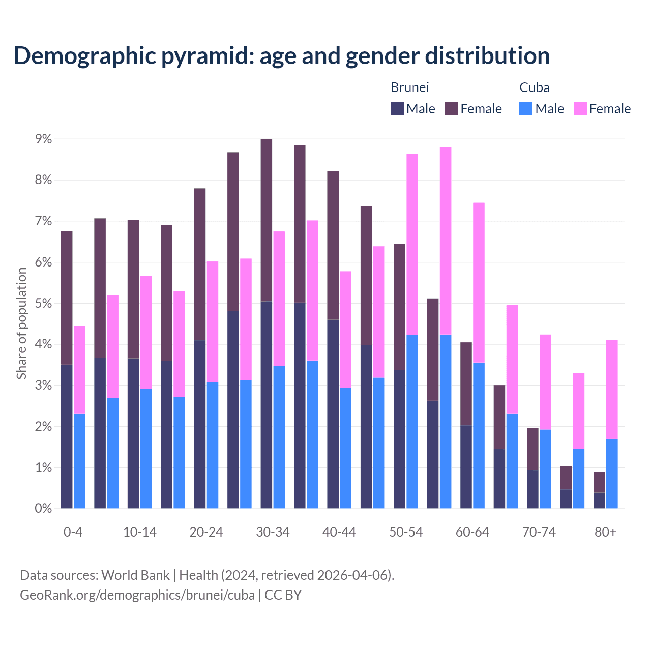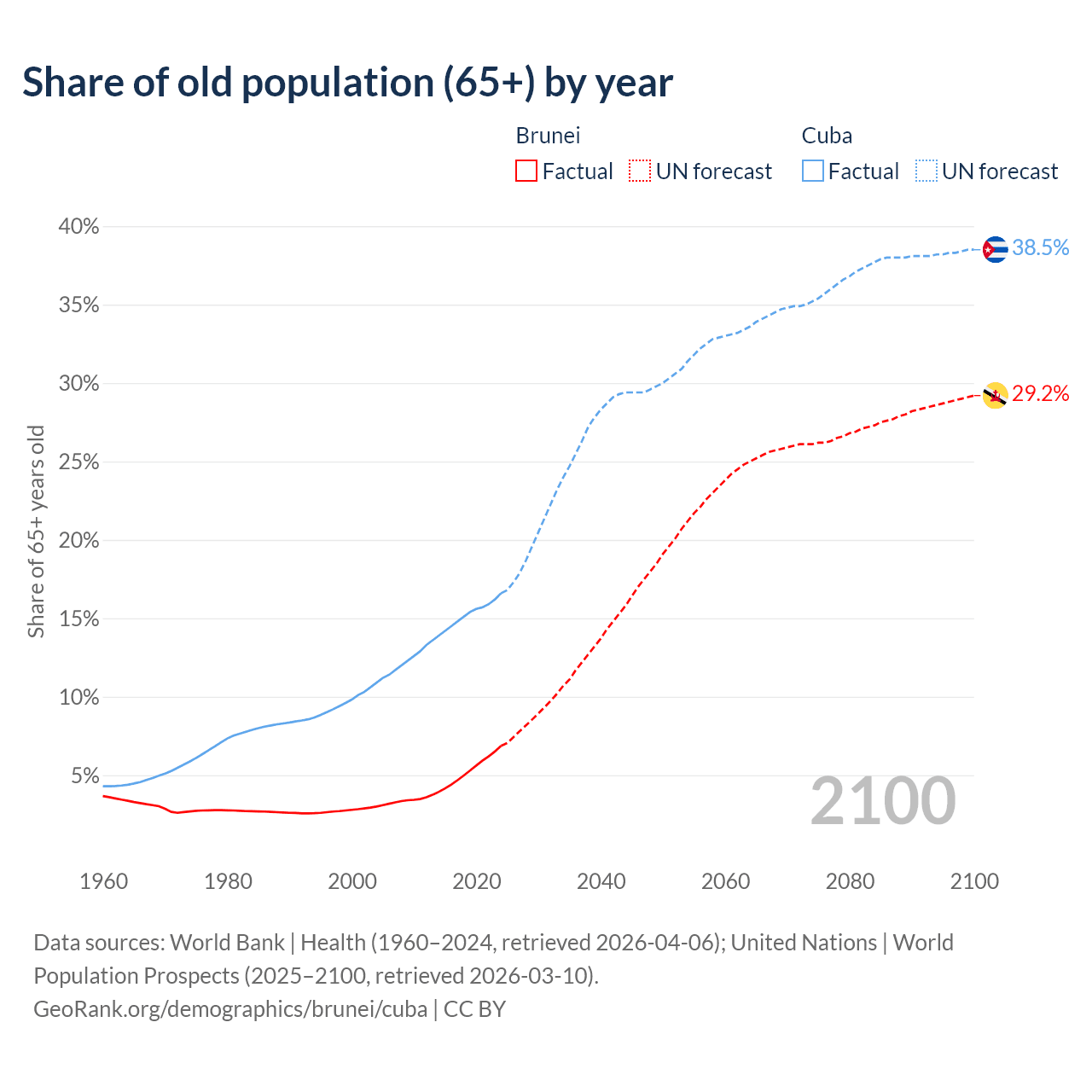 - The share of old-age demographic (65+) in Brunei is 6.87% vs 16.6% in Cuba.