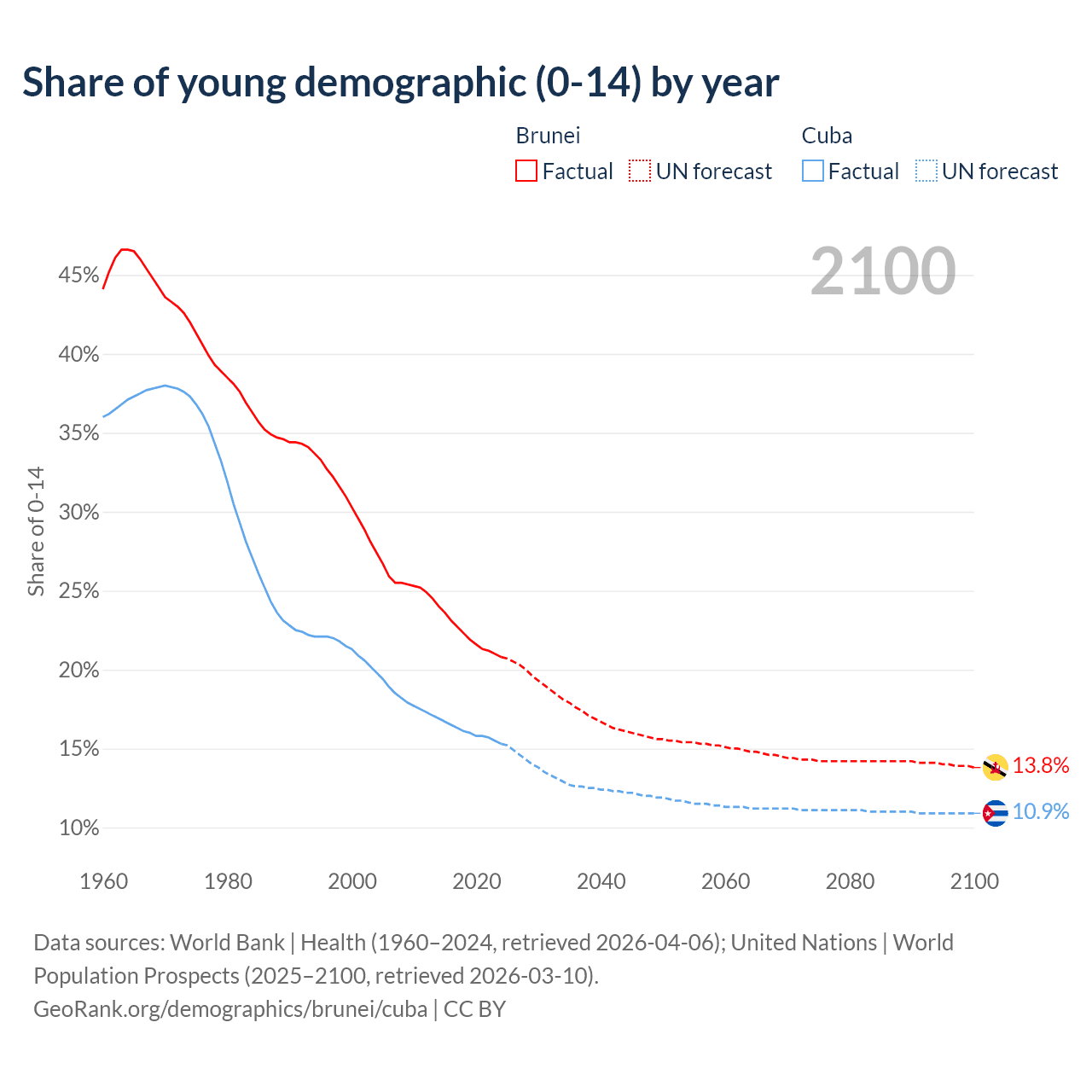 - The share of young demographic (0-15 years old) in Brunei is 20.8% vs 15.3% in Cuba.