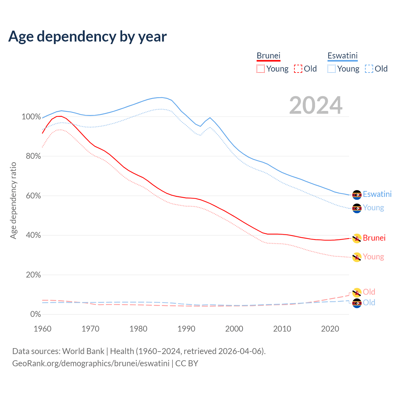 - The share of old-age demographic (65+) in Brunei is 6.87% vs 4.26% in Eswatini.