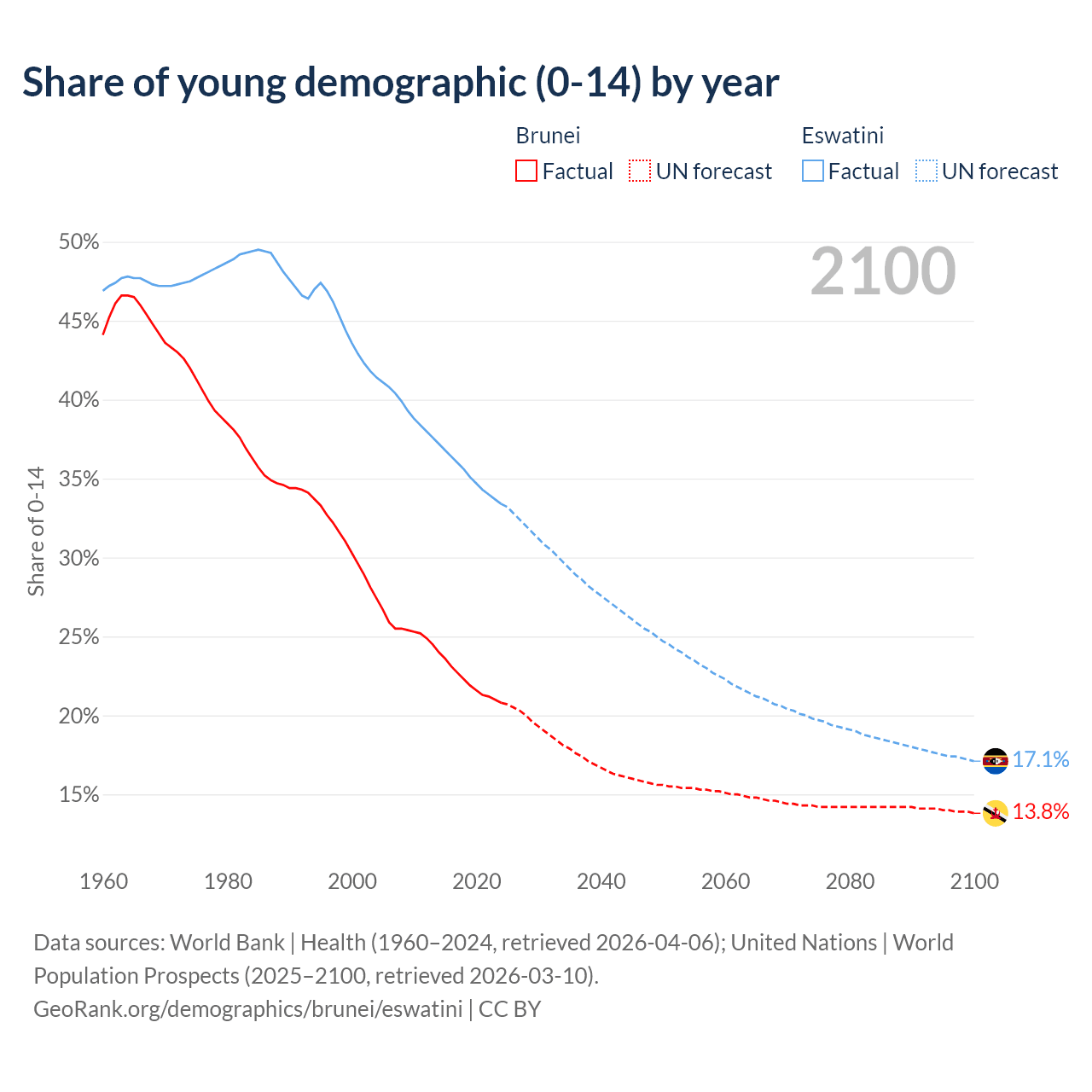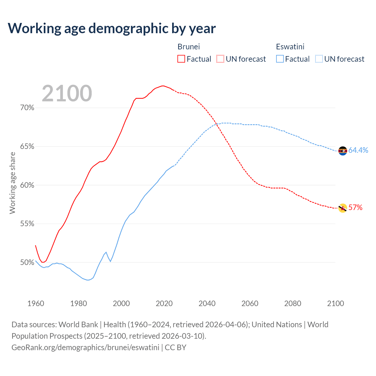 Median age Brunei vs Eswatini, 1960-2100