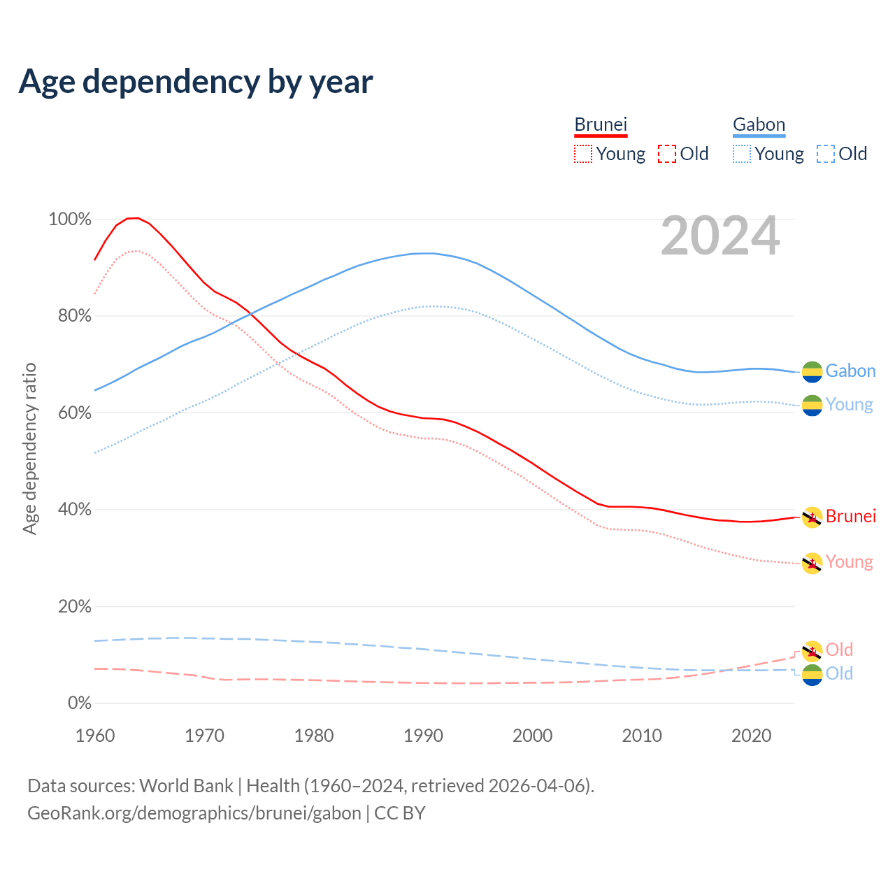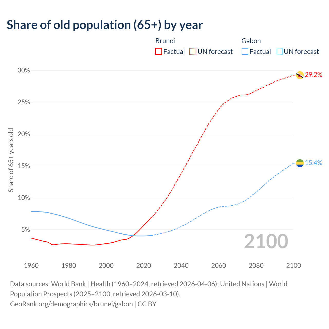 - The share of old-age demographic (65+) in Brunei is 6.87% vs 4.08% in Gabon.