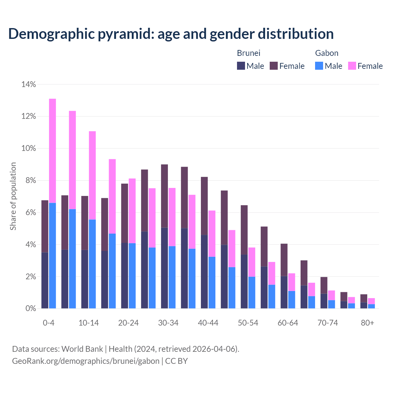 The share of older people aged 65 and over is 6.87% in Brunei and 4.08% in Gabon. Life expectancy in Brunei compared to Gabon .