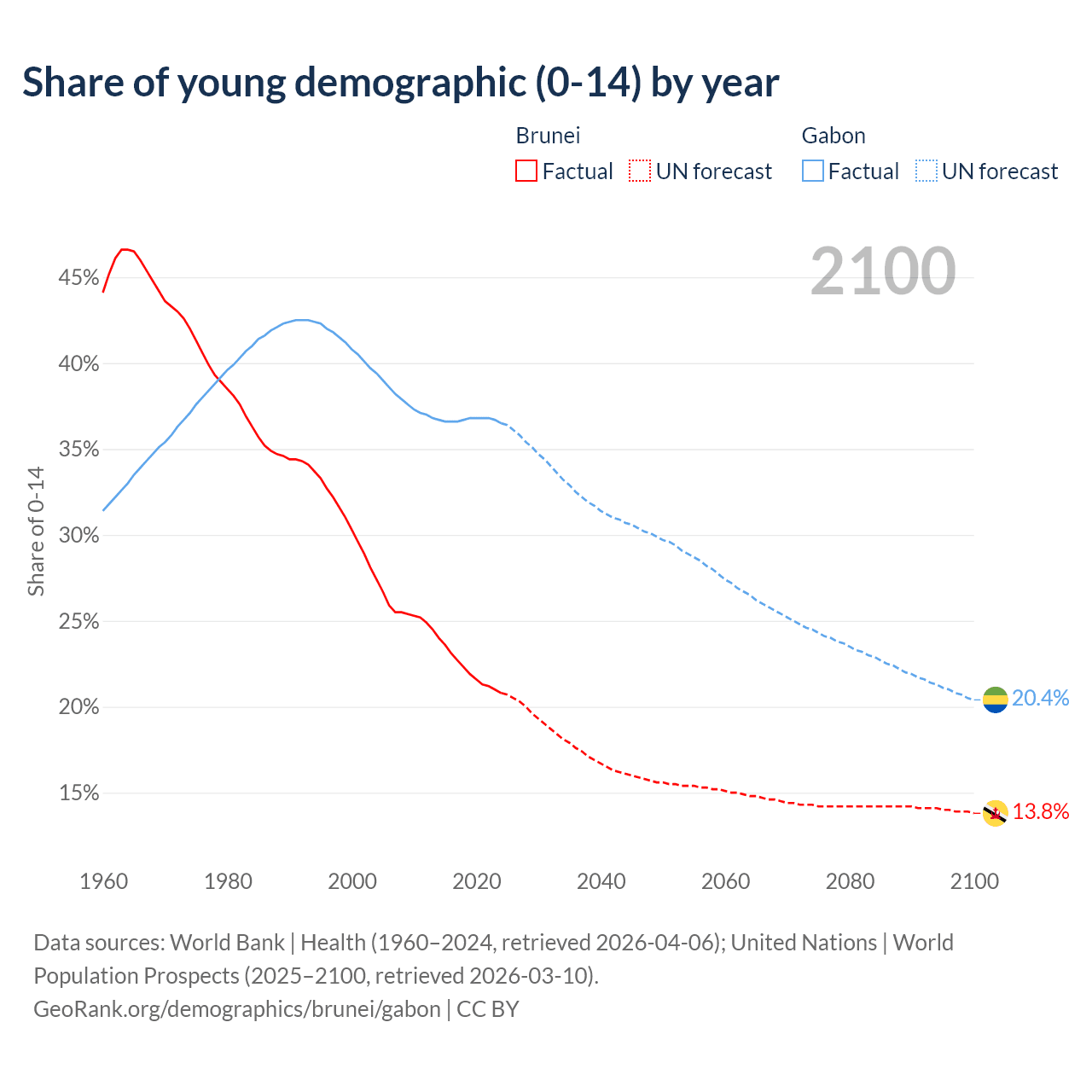 - The share of young demographic (0-15 years old) in Brunei is 20.8% vs 36.5% in Gabon.