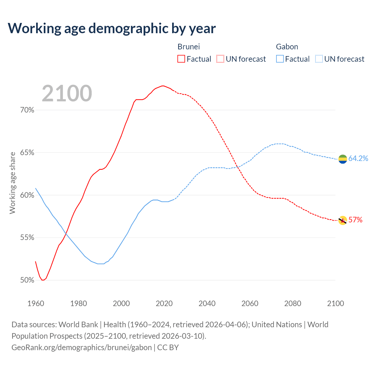 Median age Brunei vs Gabon, 1960-2100