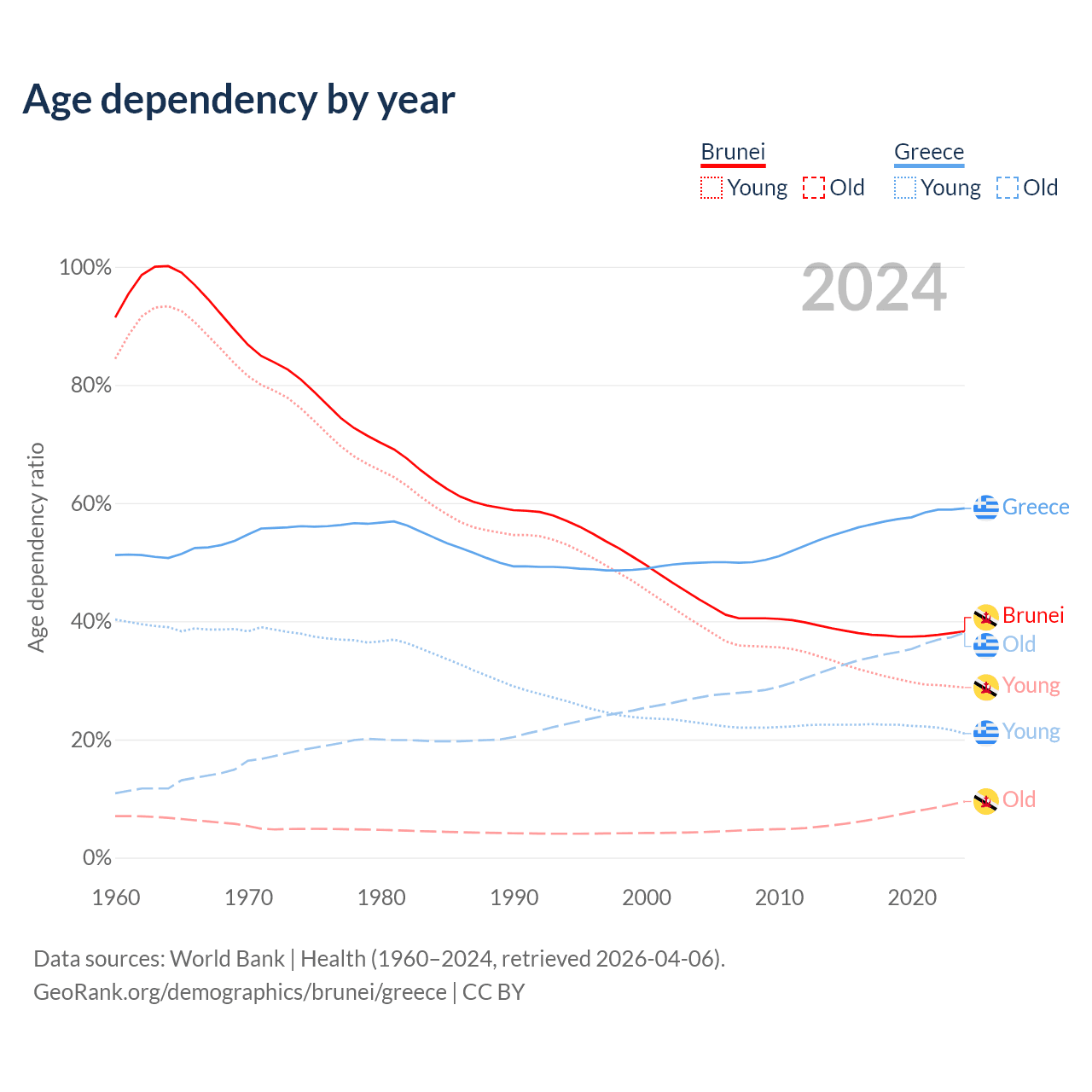 - The share of old-age demographic (65+) in Brunei is 6.87% vs 23.9% in Greece.