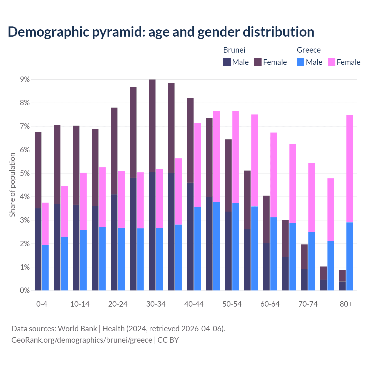 - The median age in Brunei is 33.2 years compared to 47.3 years in Greece.