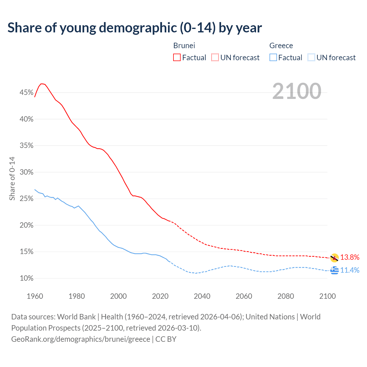 - The share of young demographic (0-15 years old) in Brunei is 20.8% vs 13.2% in Greece.