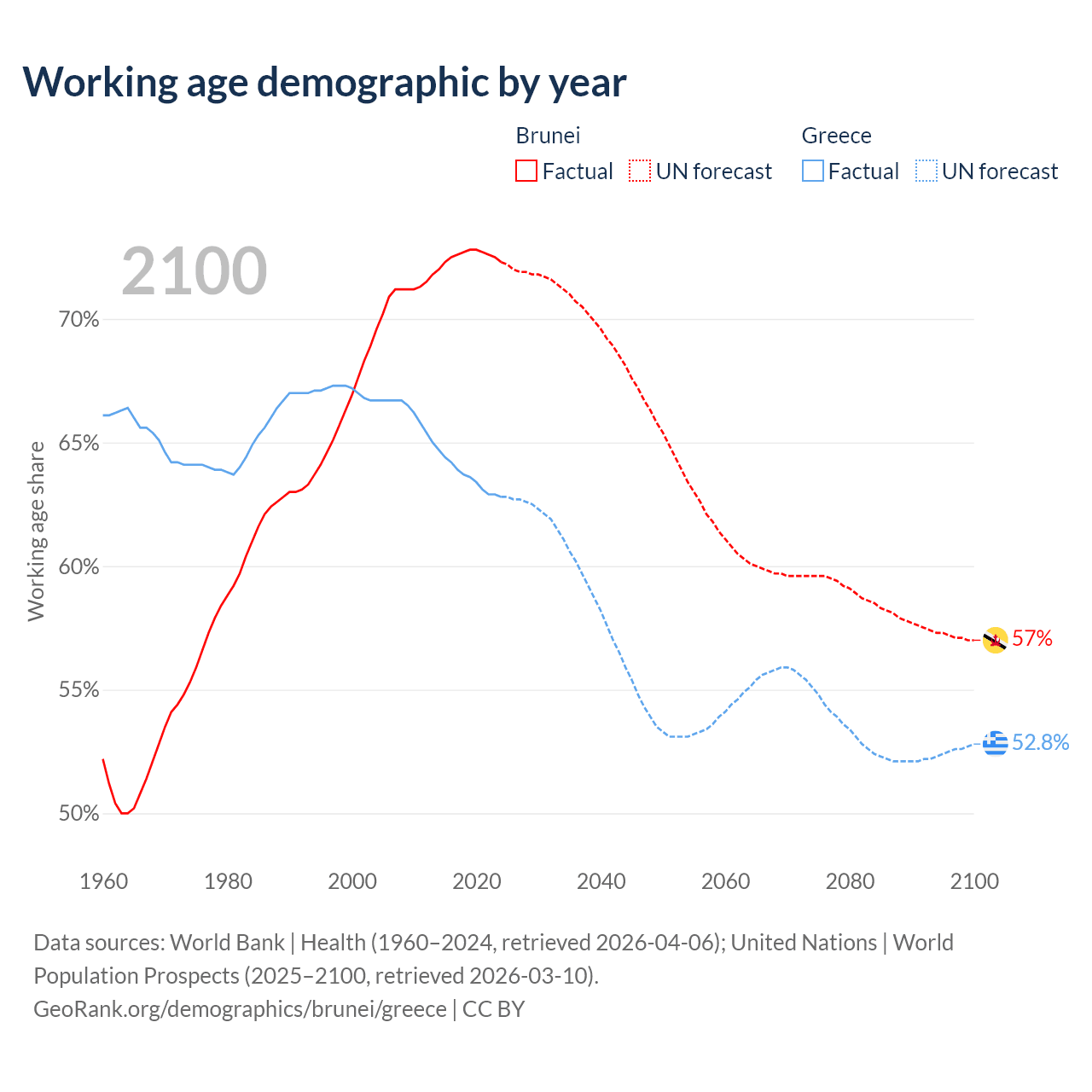 - Brunei has 340K working age adults (aged 15-64) vs 6.4M in Greece.
