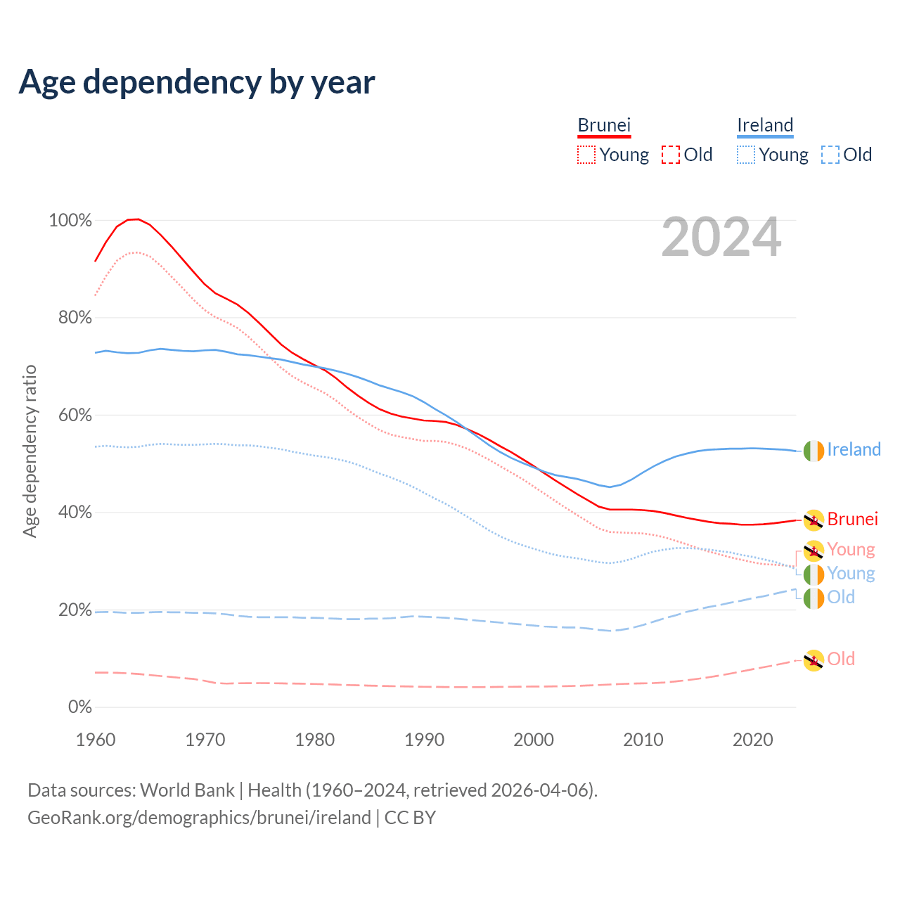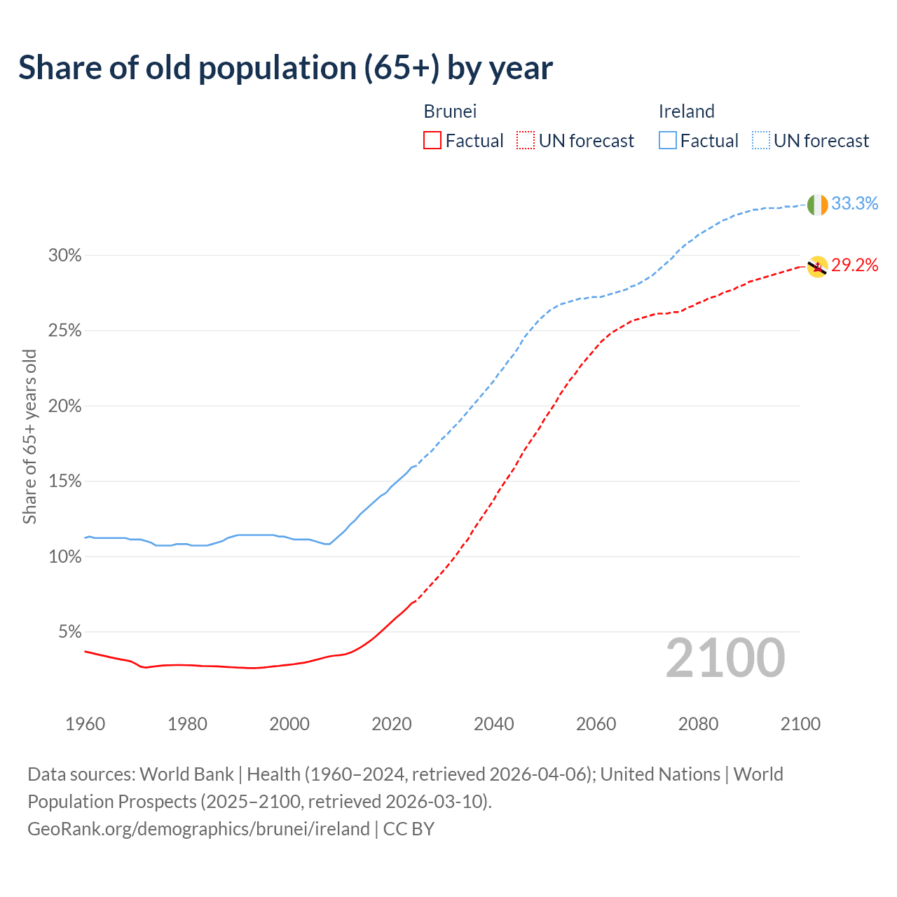 The share of older people aged 65 and over is 6.87% in Brunei and 15.9% in Ireland. Life expectancy in Brunei compared to Ireland .