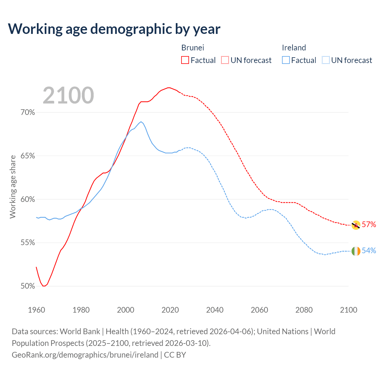 Median age Brunei vs Ireland, 1960-2100