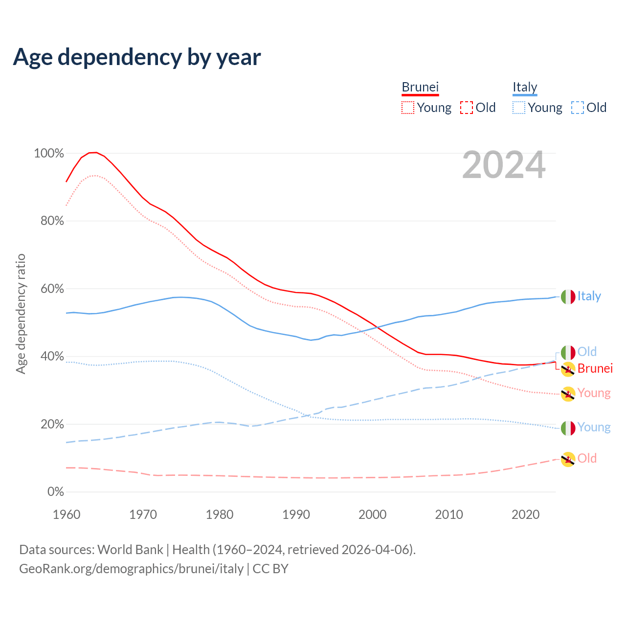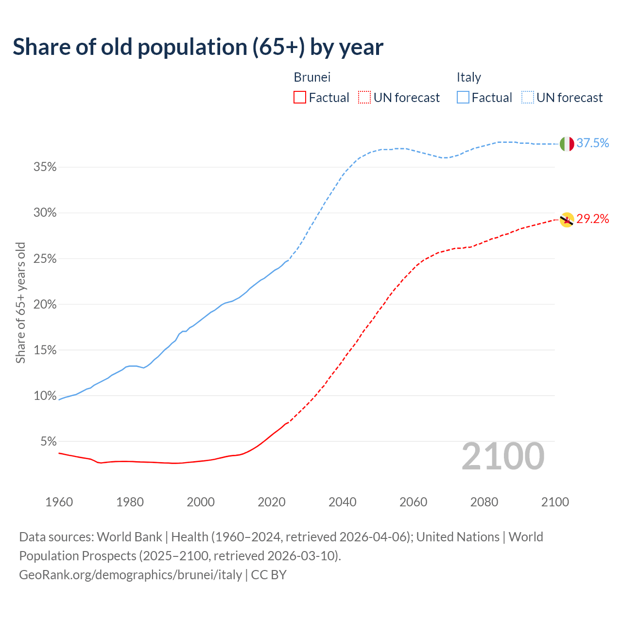 The share of older people aged 65 and over is 6.87% in Brunei and 24.6% in Italy. Life expectancy in Brunei compared to Italy .