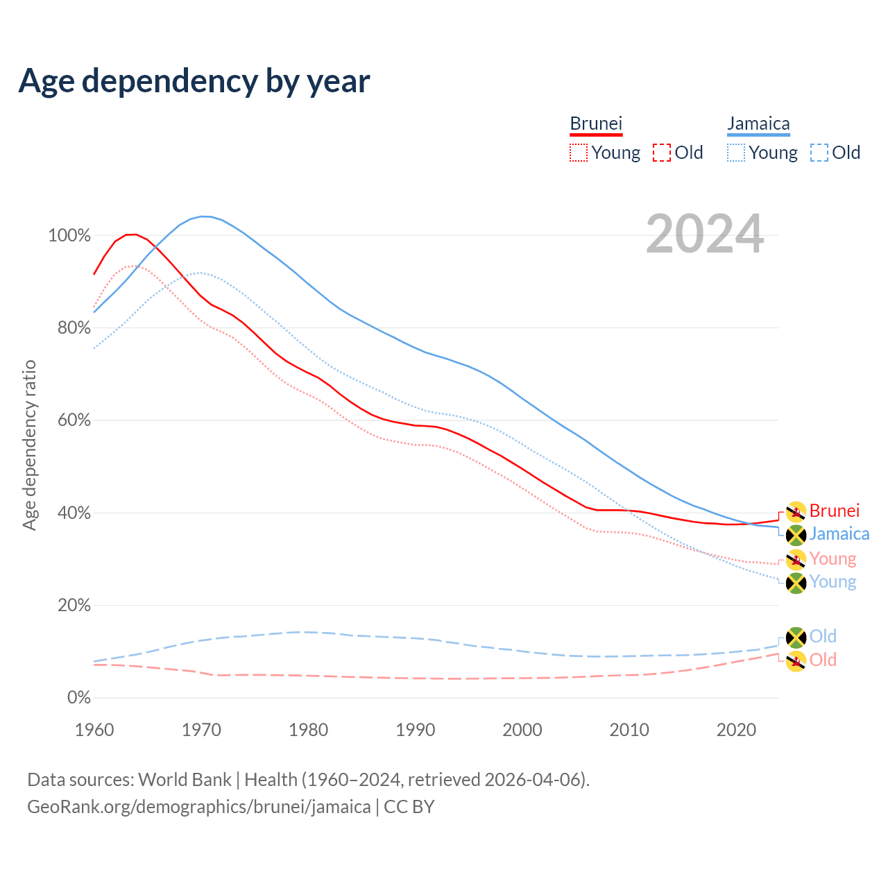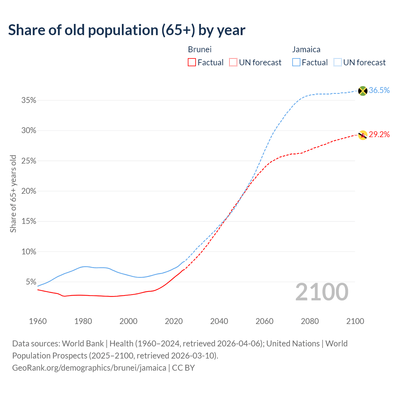 - The share of old-age demographic (65+) in Brunei is 6.87% vs 8.21% in Jamaica.