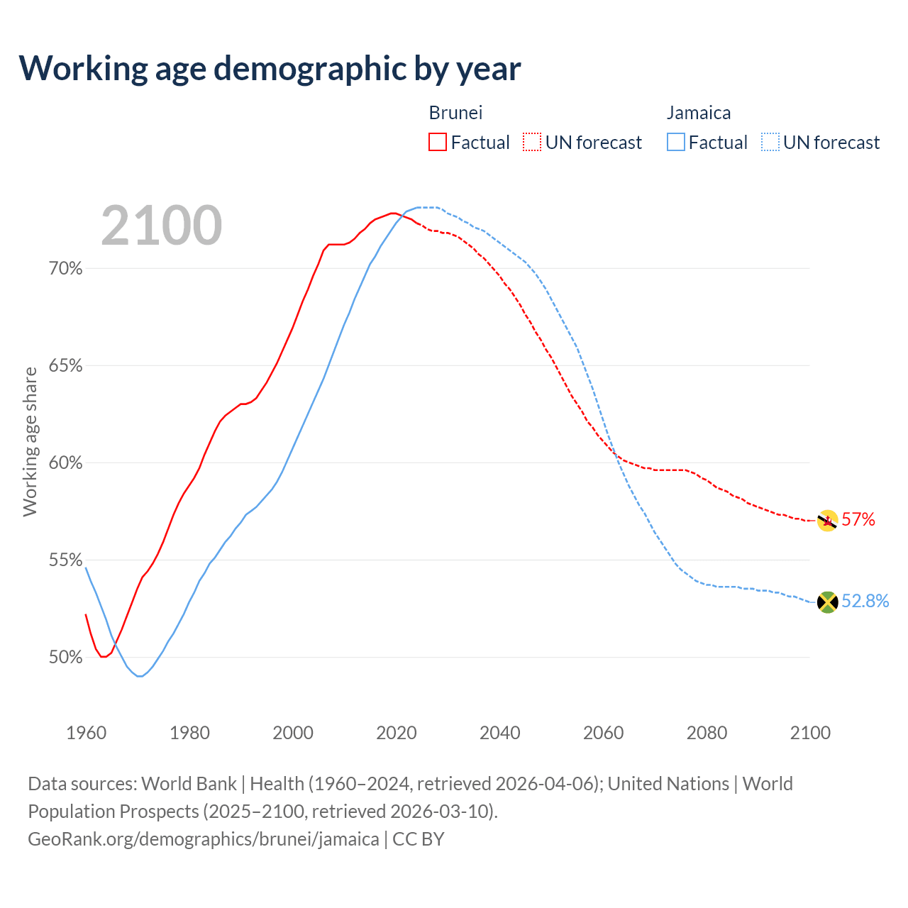 - Brunei has 340K working age adults (aged 15-64) vs 2.07M in Jamaica.