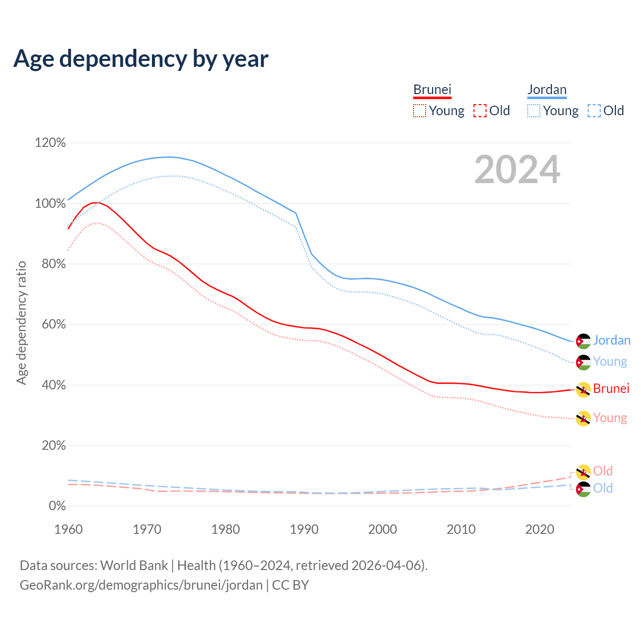 - The share of old-age demographic (65+) in Brunei is 6.87% vs 4.52% in Jordan.