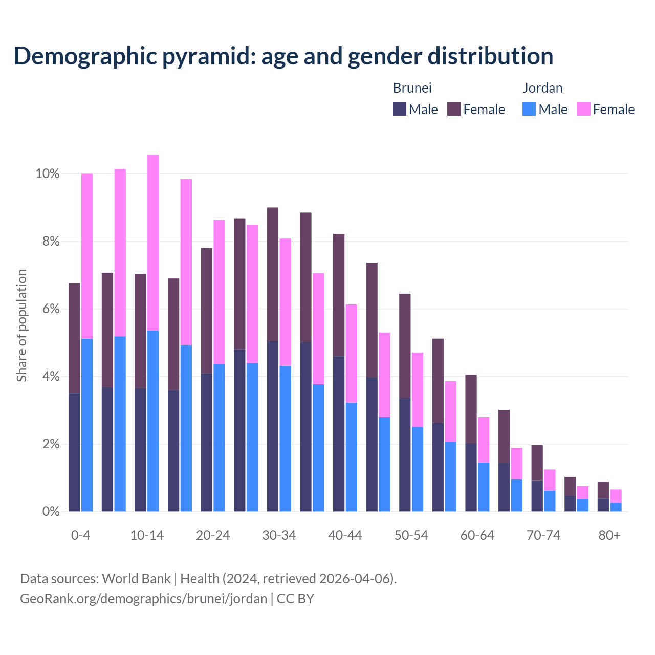 - Brunei is ranked 88/196 by median age (oldest to youngest) vs 131/196 for Jordan.