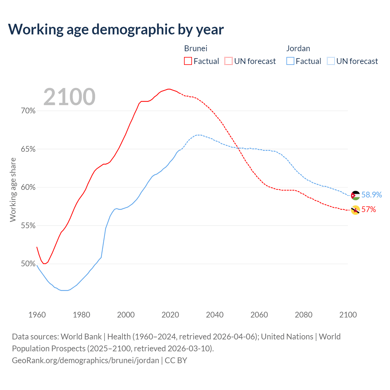 - Brunei has 340K working age adults (aged 15-64) vs 7.49M in Jordan.