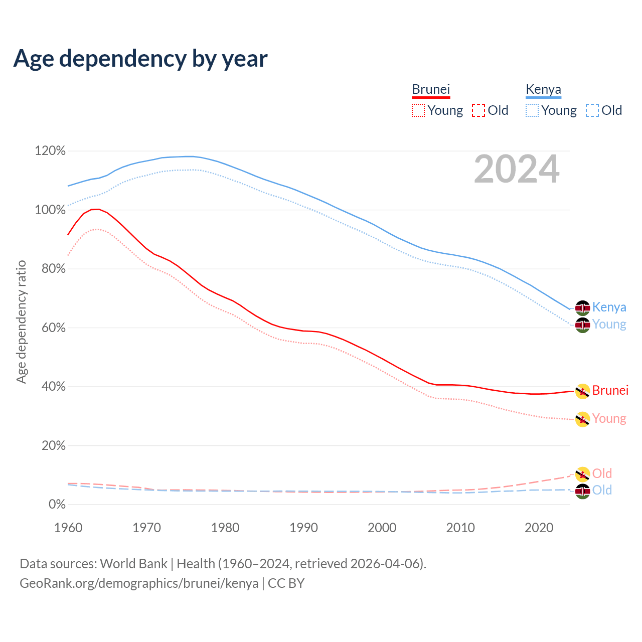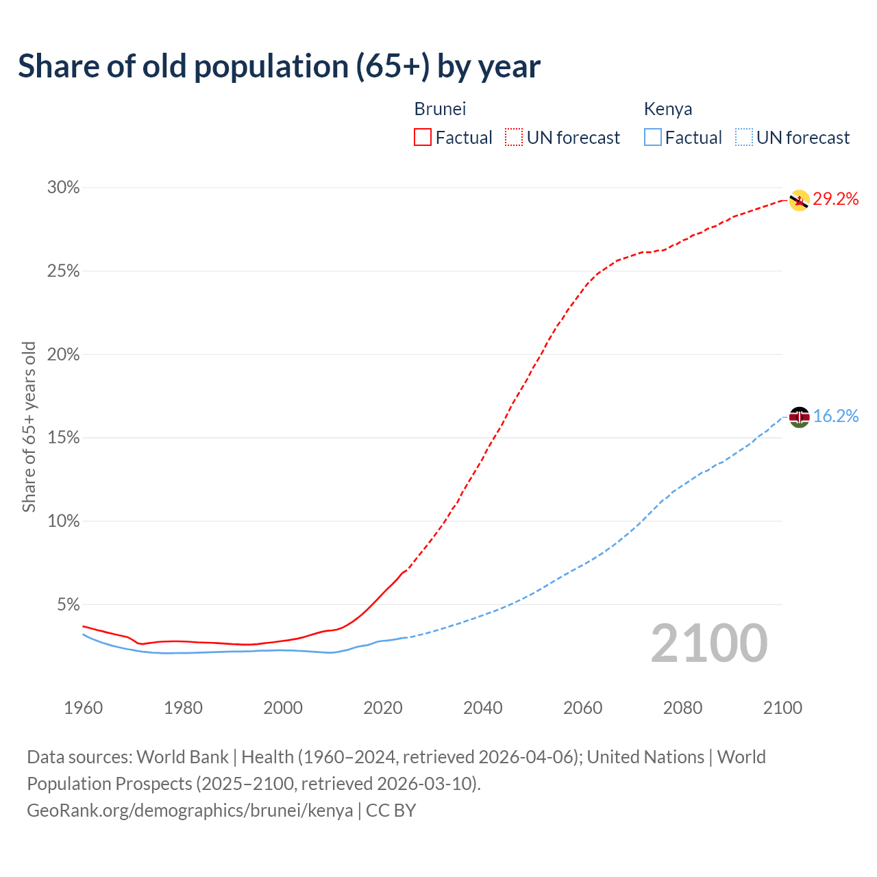 - The share of old-age demographic (65+) in Brunei is 6.87% vs 2.97% in Kenya.