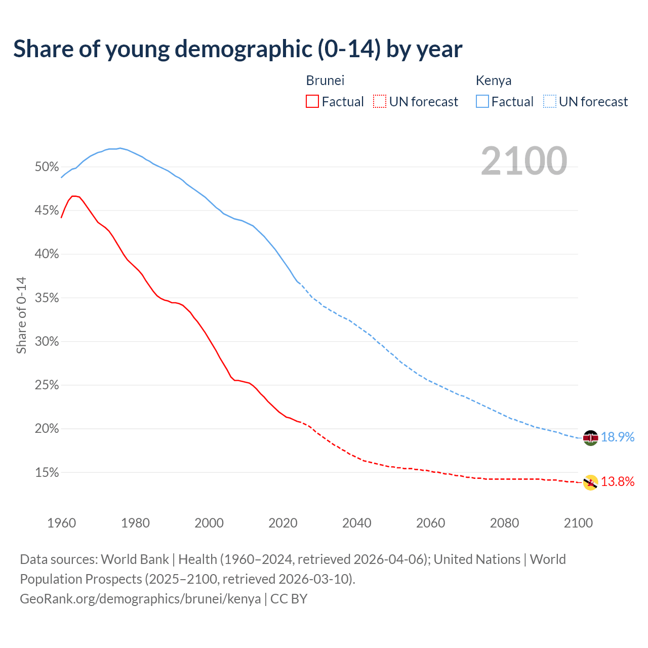 - The share of young demographic (0-15 years old) in Brunei is 20.8% vs 36.8% in Kenya.