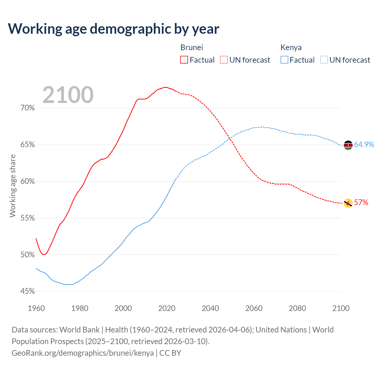 The share of older people aged 65 and over is 6.87% in Brunei and 2.97% in Kenya. Life expectancy in Brunei compared to Kenya .