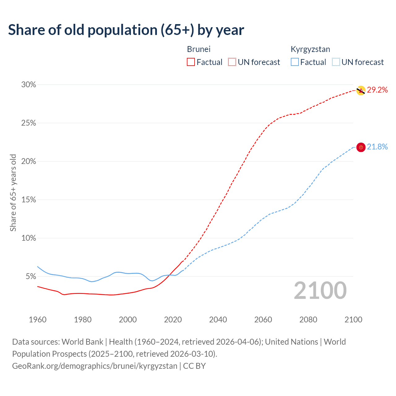 - The share of old-age demographic (65+) in Brunei is 6.87% vs 5.68% in Kyrgyzstan.
