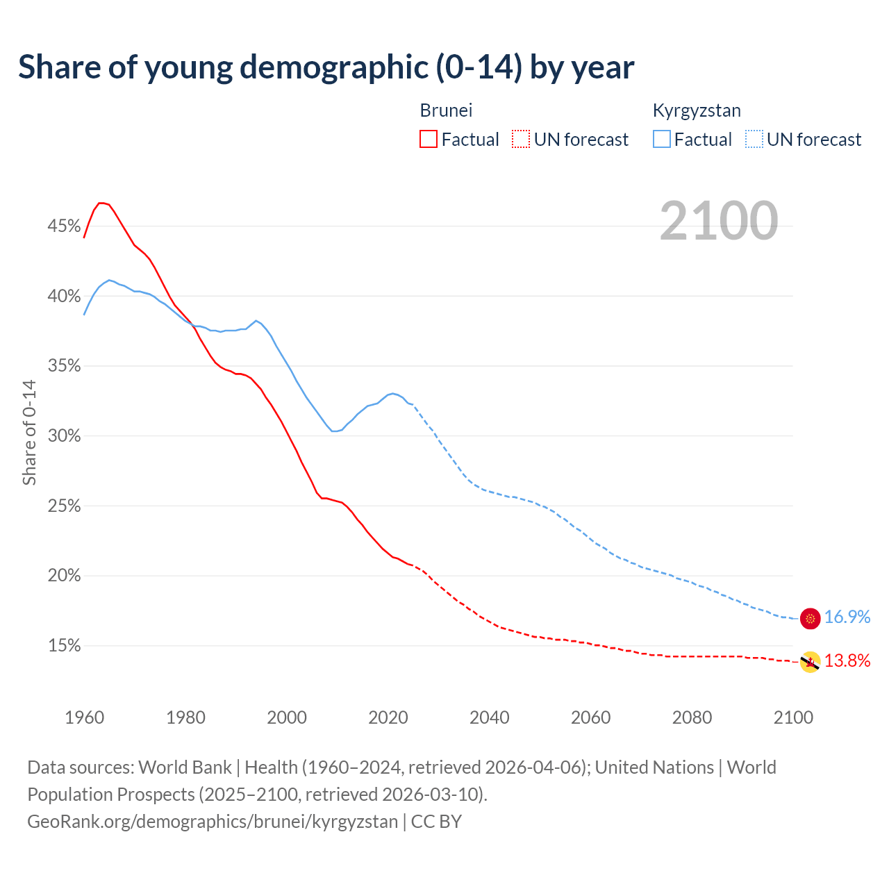 - The share of young demographic (0-15 years old) in Brunei is 20.8% vs 32.3% in Kyrgyzstan.