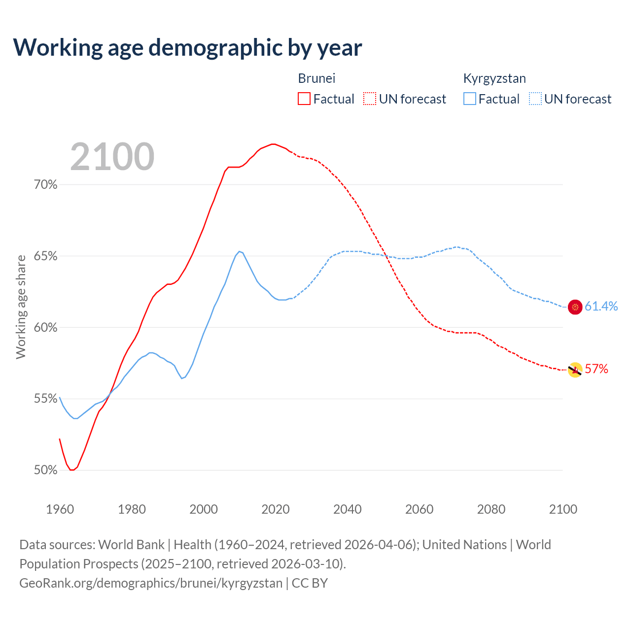- Brunei has 340K working age adults (aged 15-64) vs 4.63M in Kyrgyzstan.