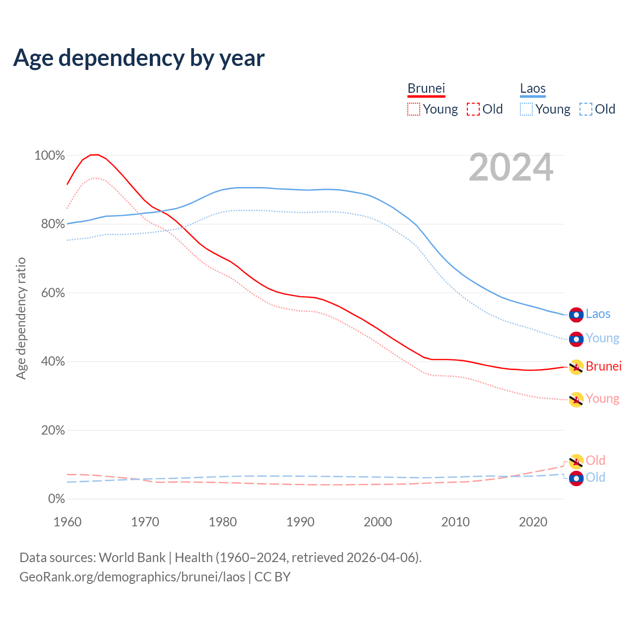 - Brunei is ranked 88/196 by median age (oldest to youngest) vs 130/196 for Laos.