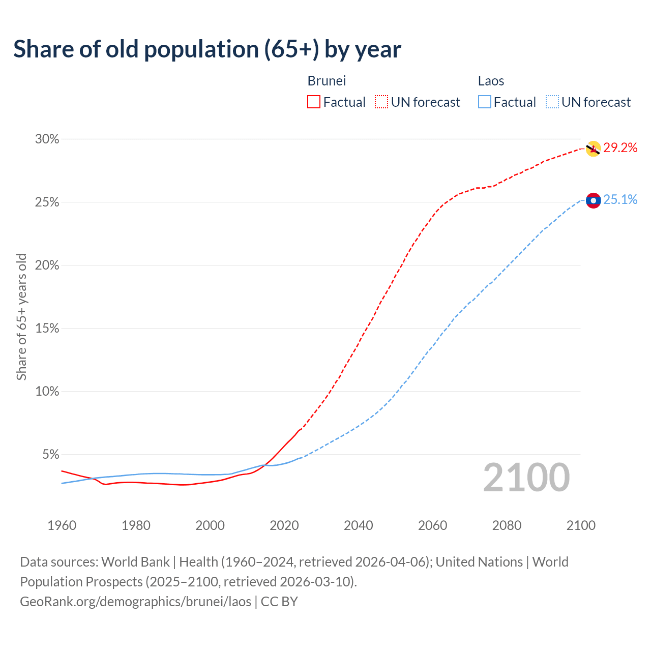 - The share of old-age demographic (65+) in Brunei is 6.87% vs 4.67% in Laos.