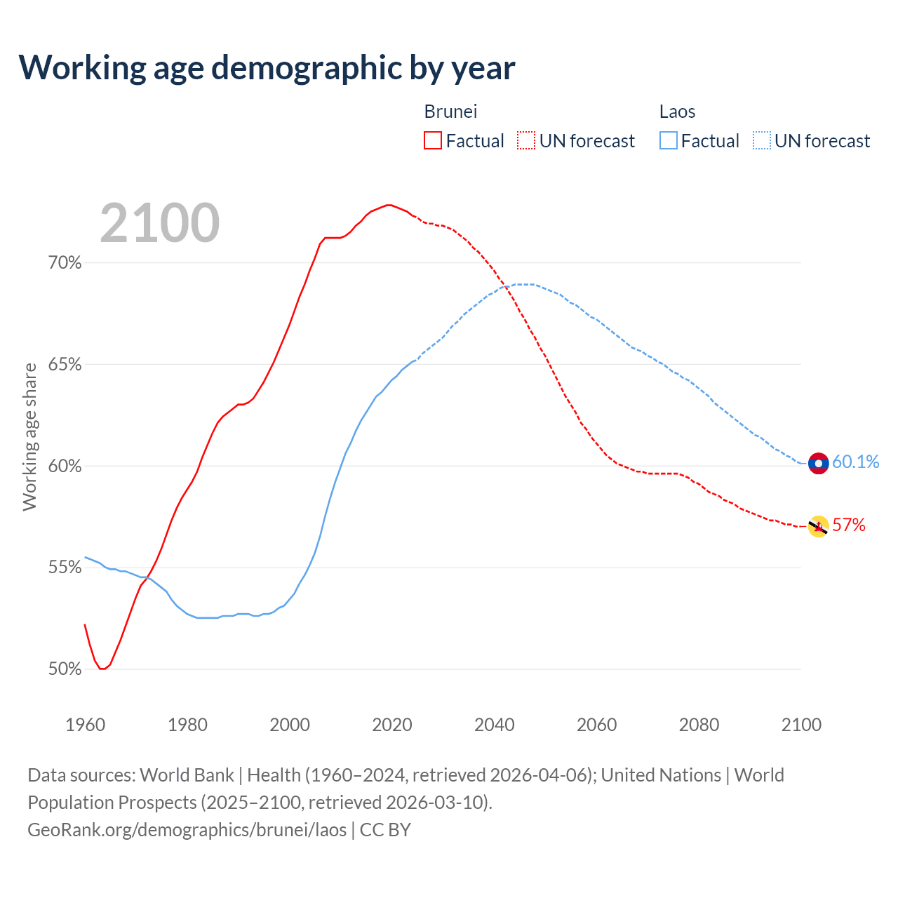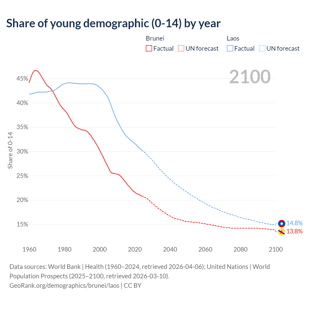 - As of 2026, the population of Brunei is 471K vs 8M in Laos - 17 times difference.