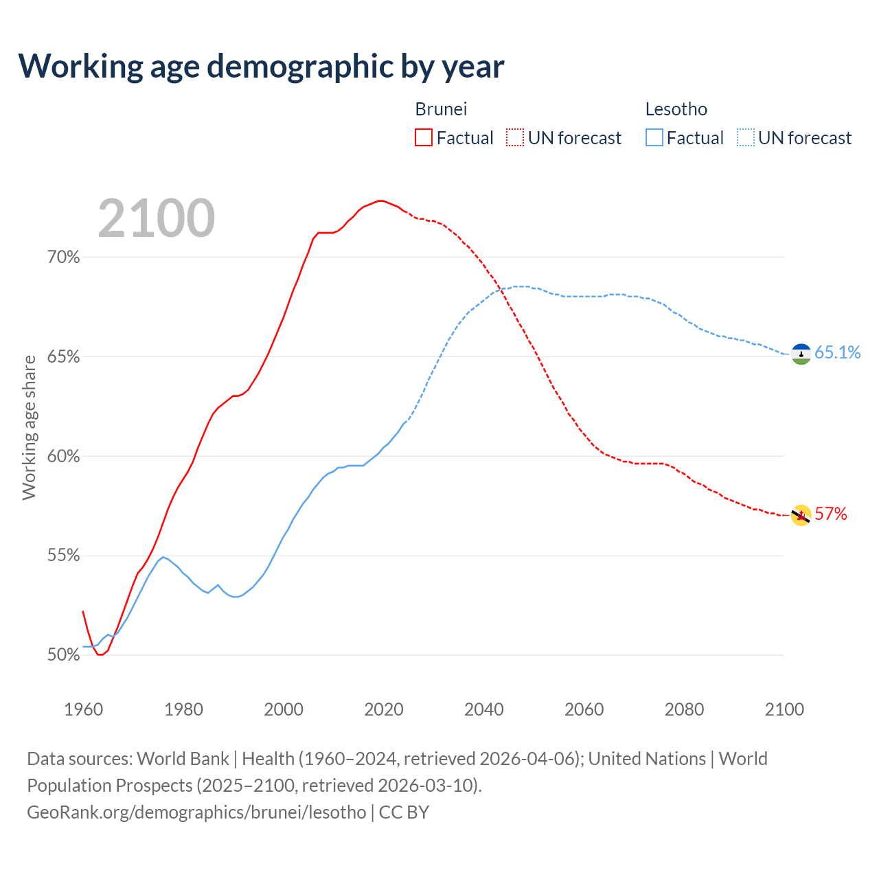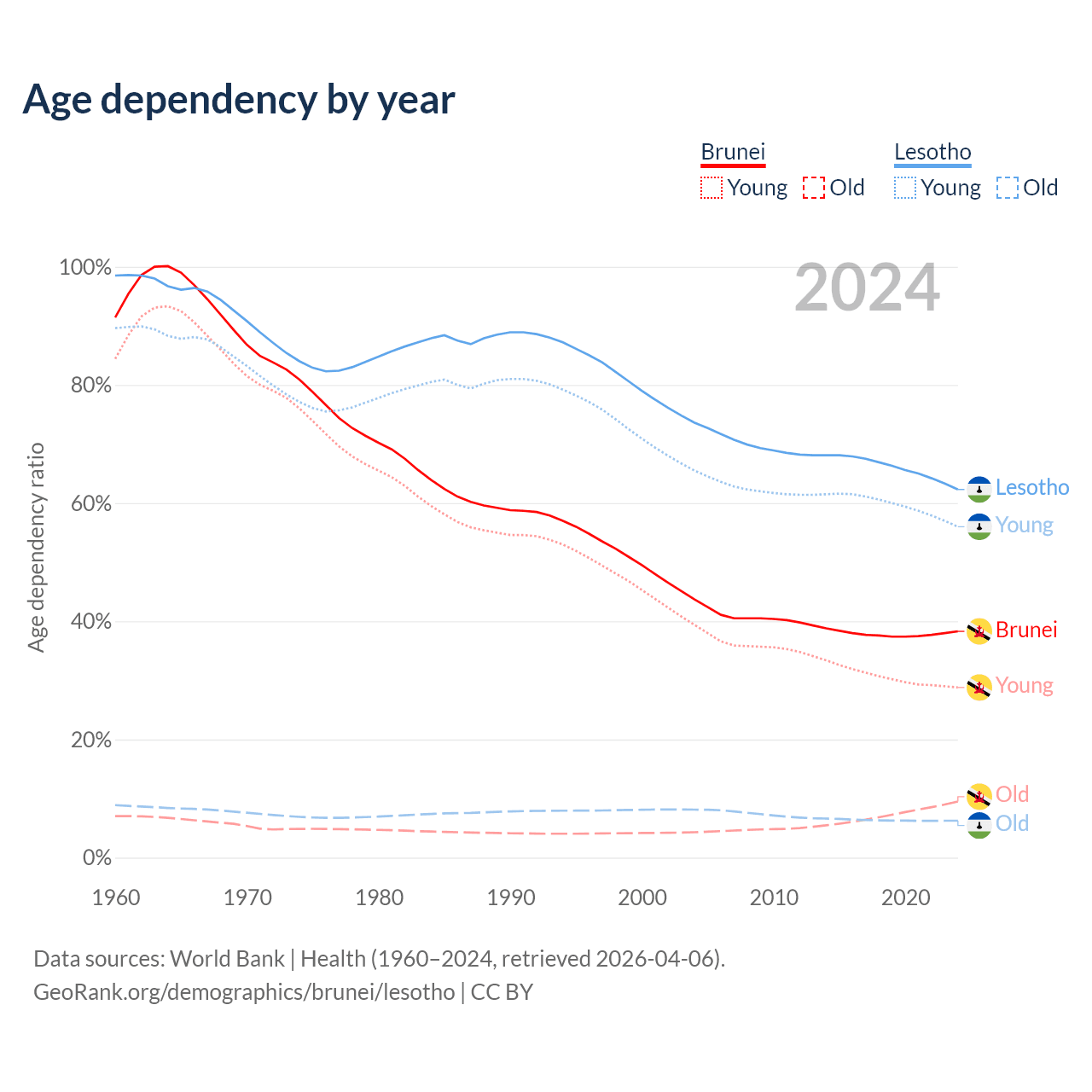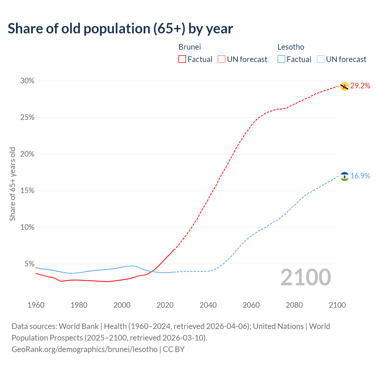 - The share of old-age demographic (65+) in Brunei is 6.87% vs 3.86% in Lesotho.