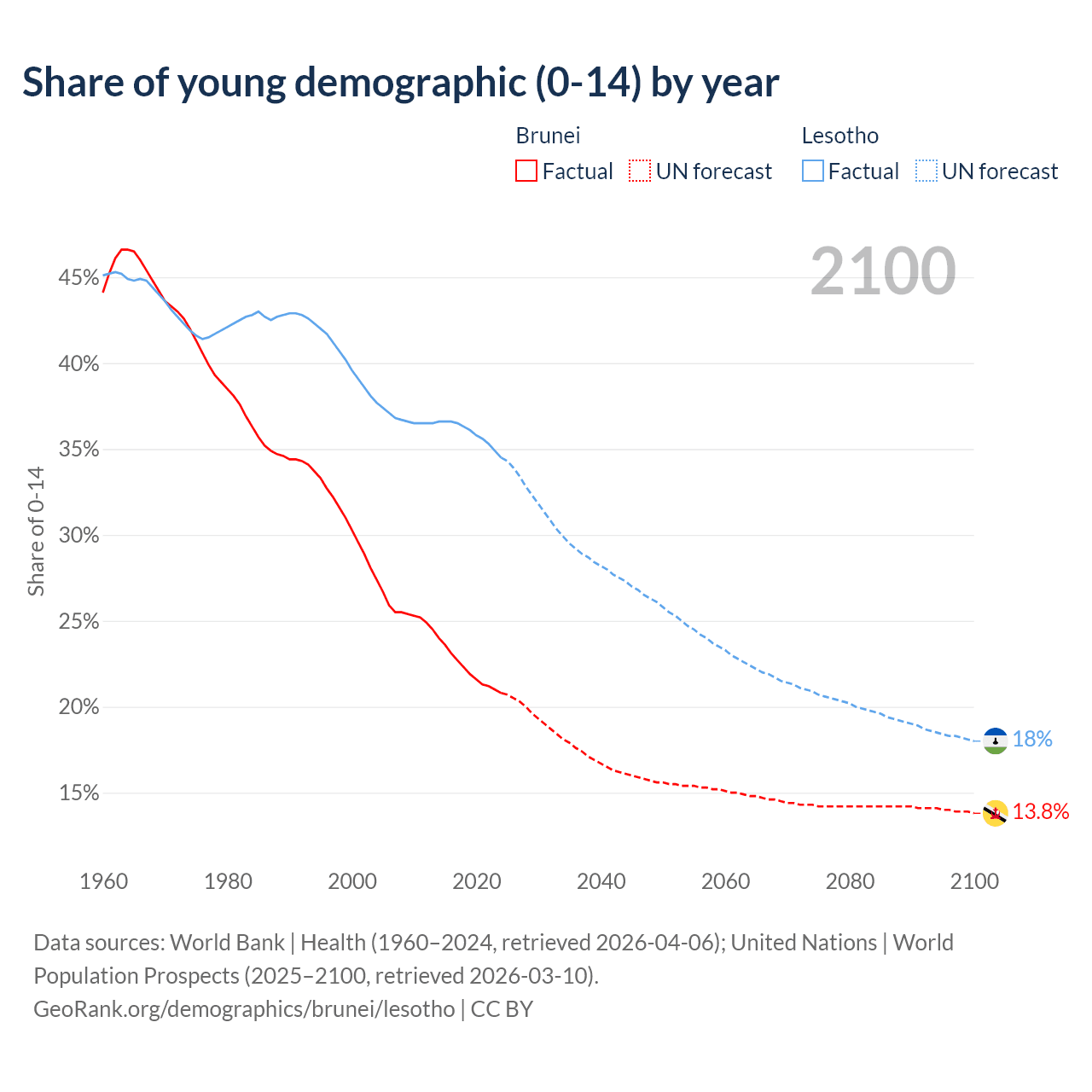 - The share of young demographic (0-15 years old) in Brunei is 20.8% vs 34.5% in Lesotho.