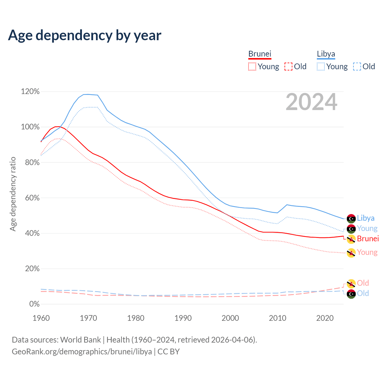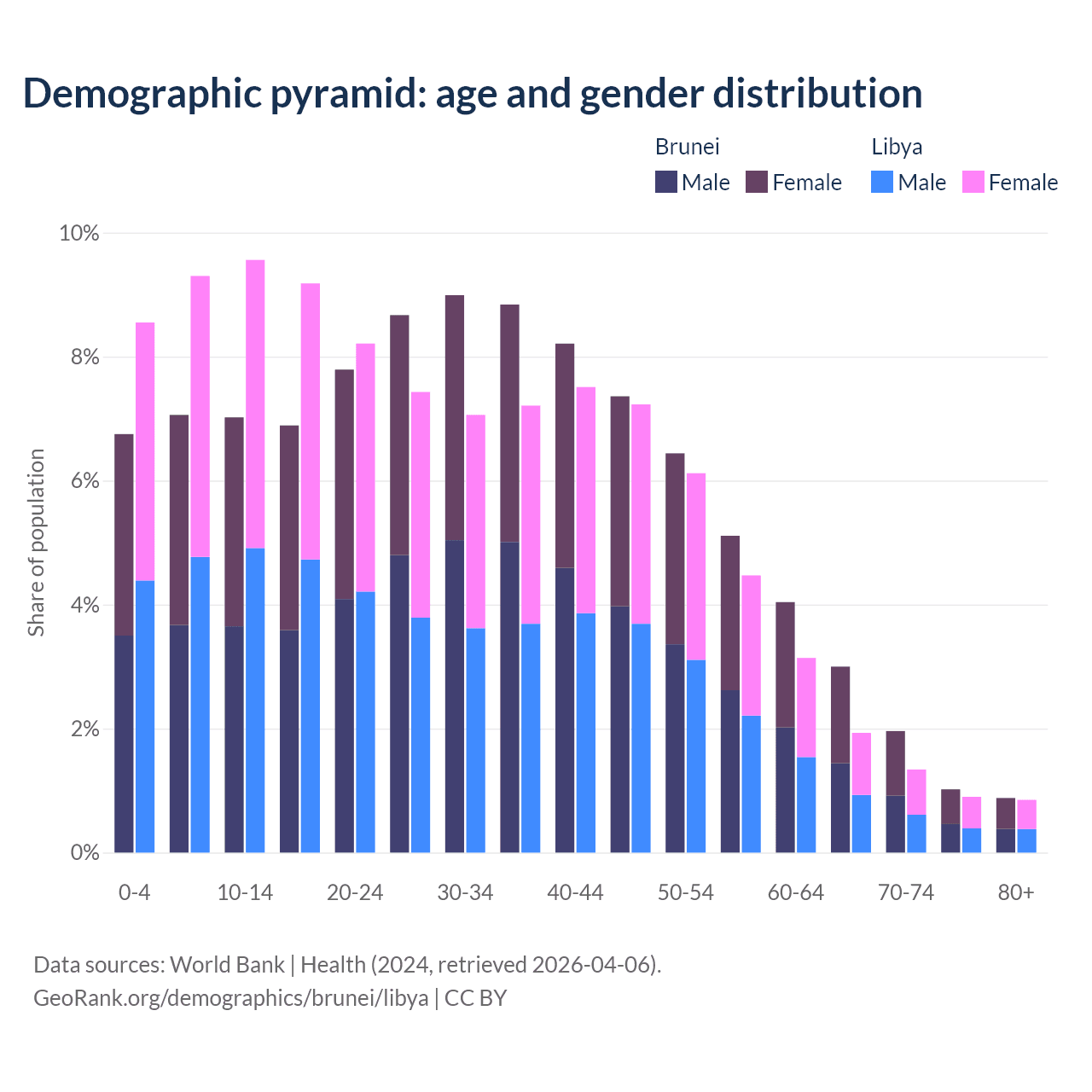 - The share of old-age demographic (65+) in Brunei is 6.87% vs 5.02% in Libya.