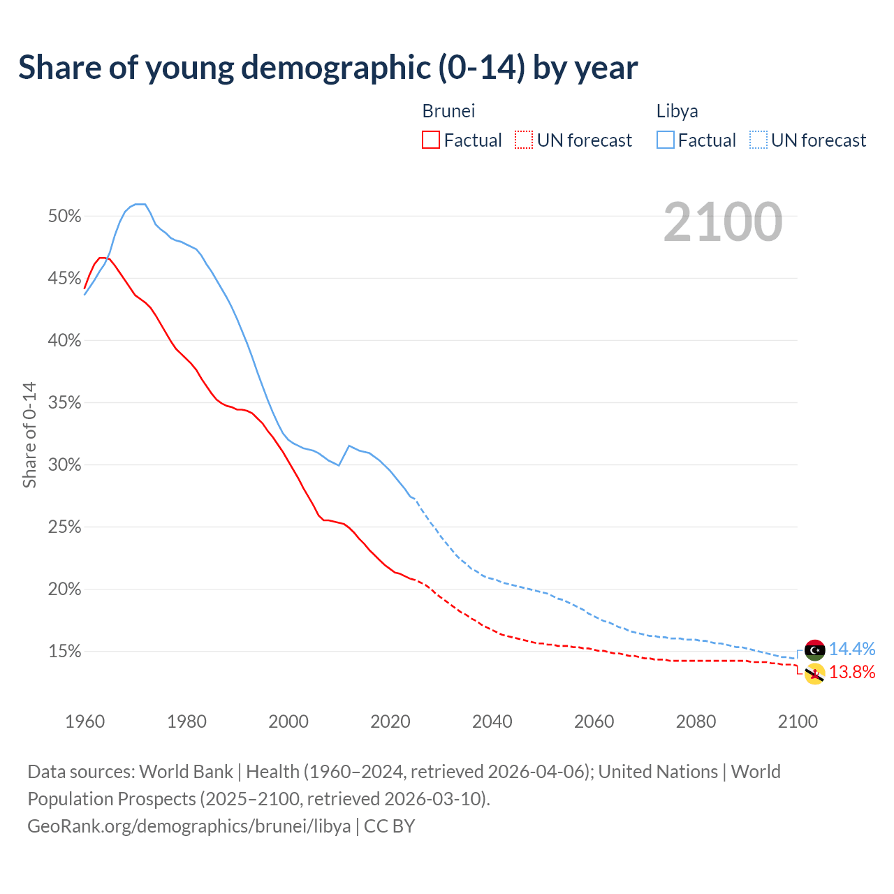- The share of young demographic (0-15 years old) in Brunei is 20.8% vs 27.4% in Libya.