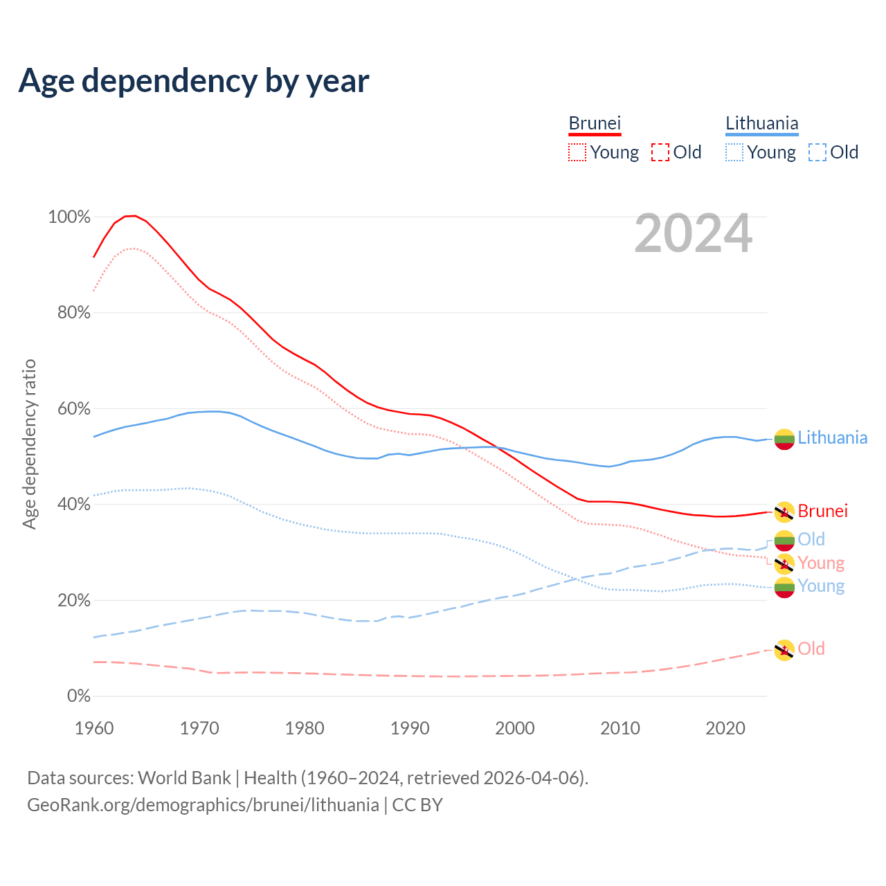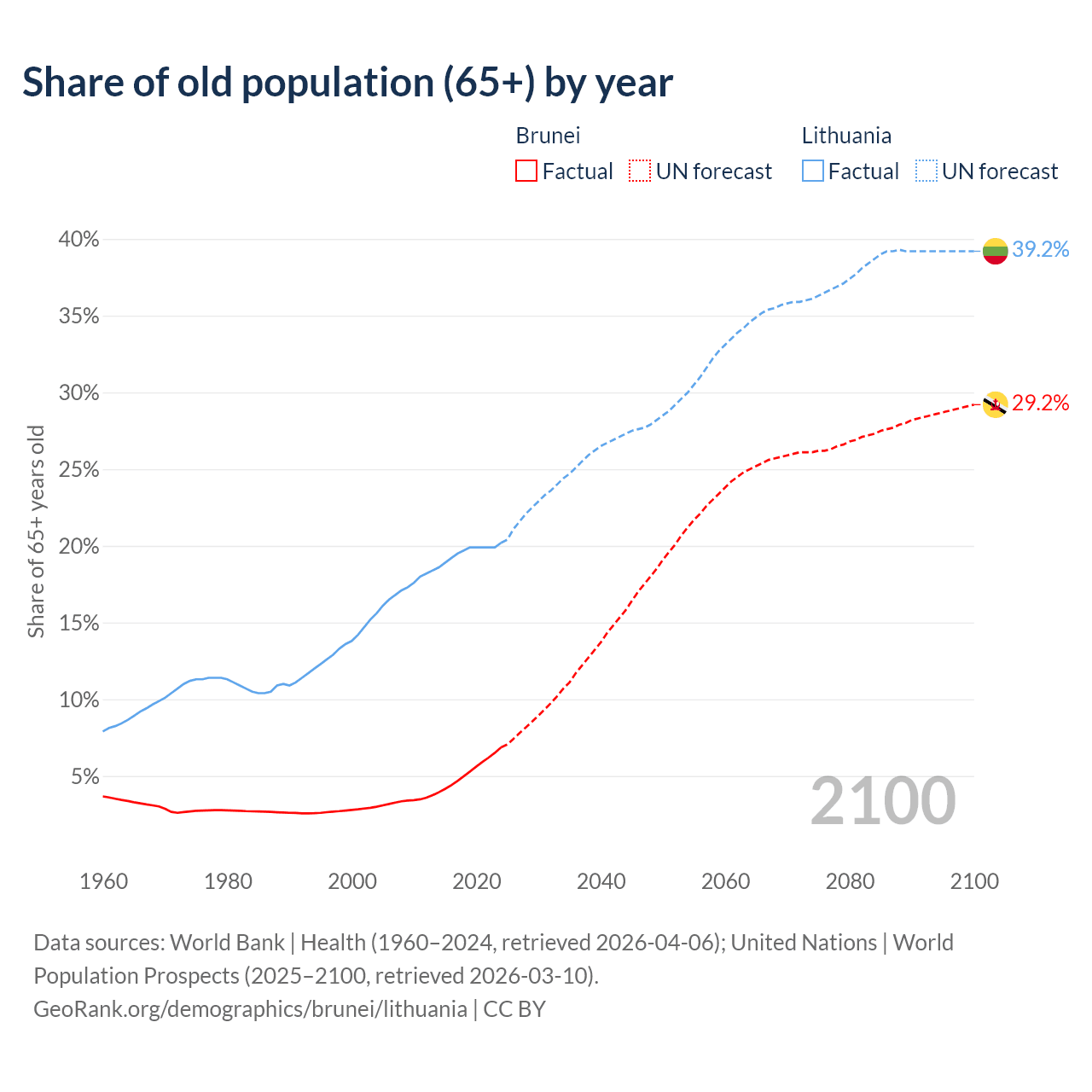 - The share of old-age demographic (65+) in Brunei is 6.87% vs 20.2% in Lithuania.