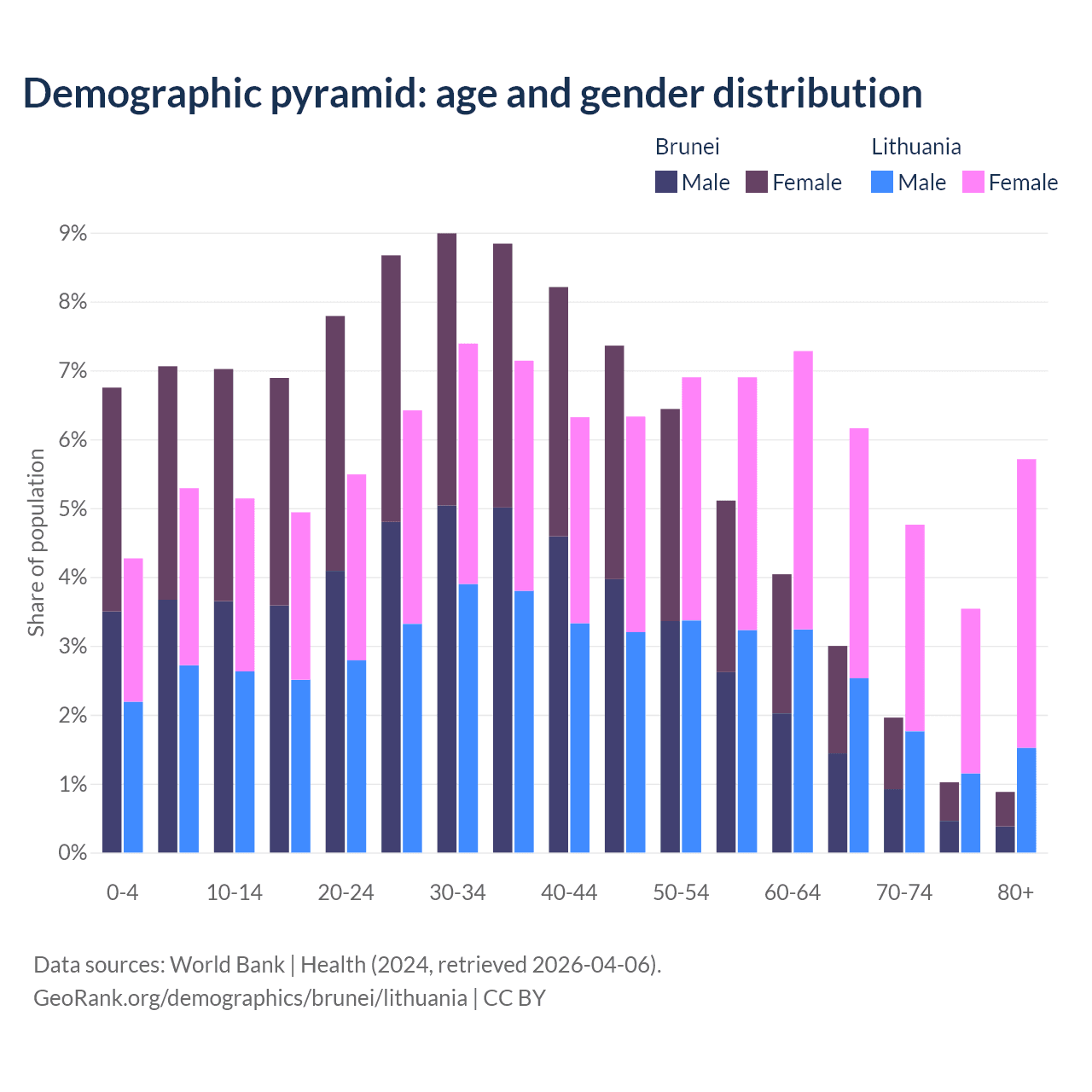 - The median age in Brunei is 33.2 years compared to 43.1 years in Lithuania.