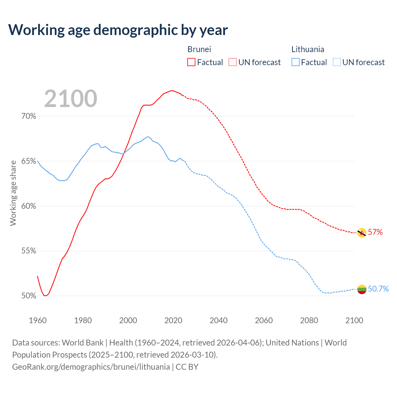 - Brunei has 340K working age adults (aged 15-64) vs 1.84M in Lithuania.