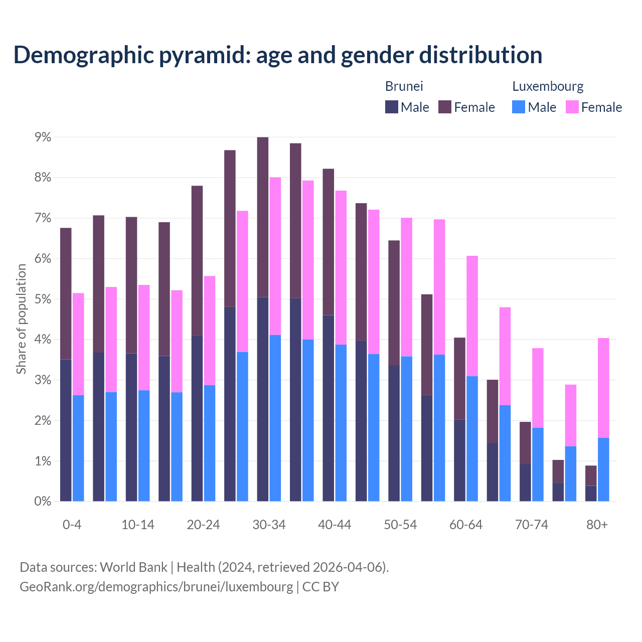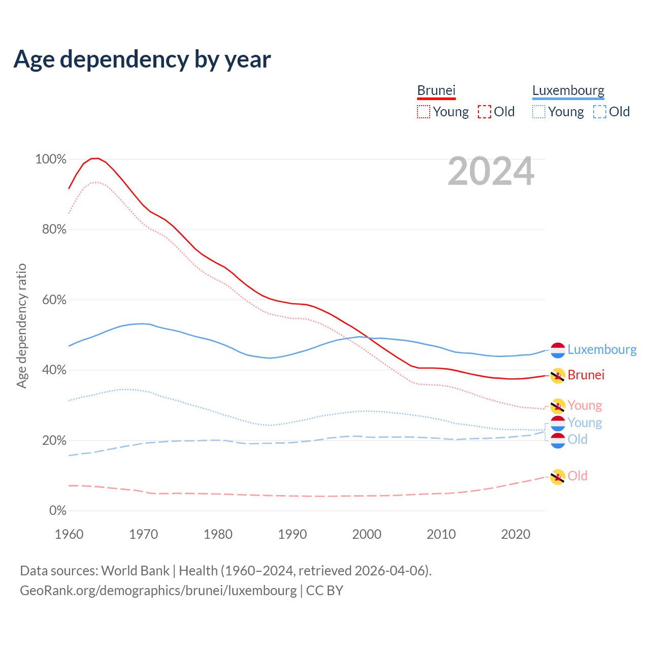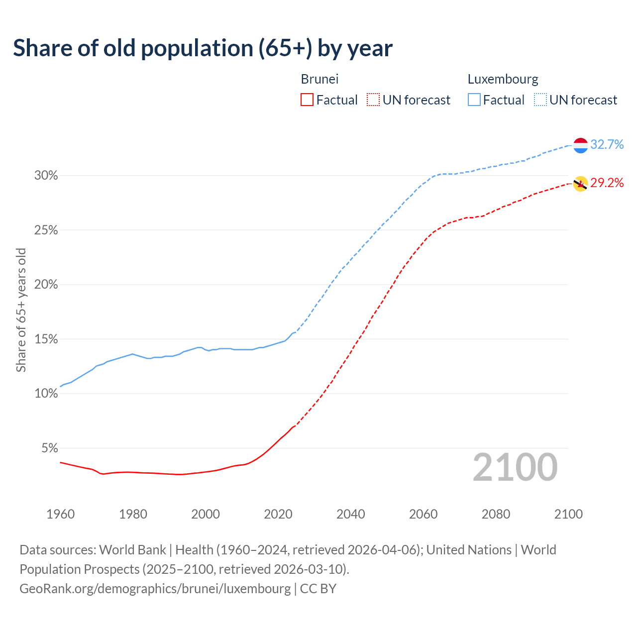 The share of older people aged 65 and over is 6.87% in Brunei and 15.5% in Luxembourg. Life expectancy in Brunei compared to Luxembourg .
