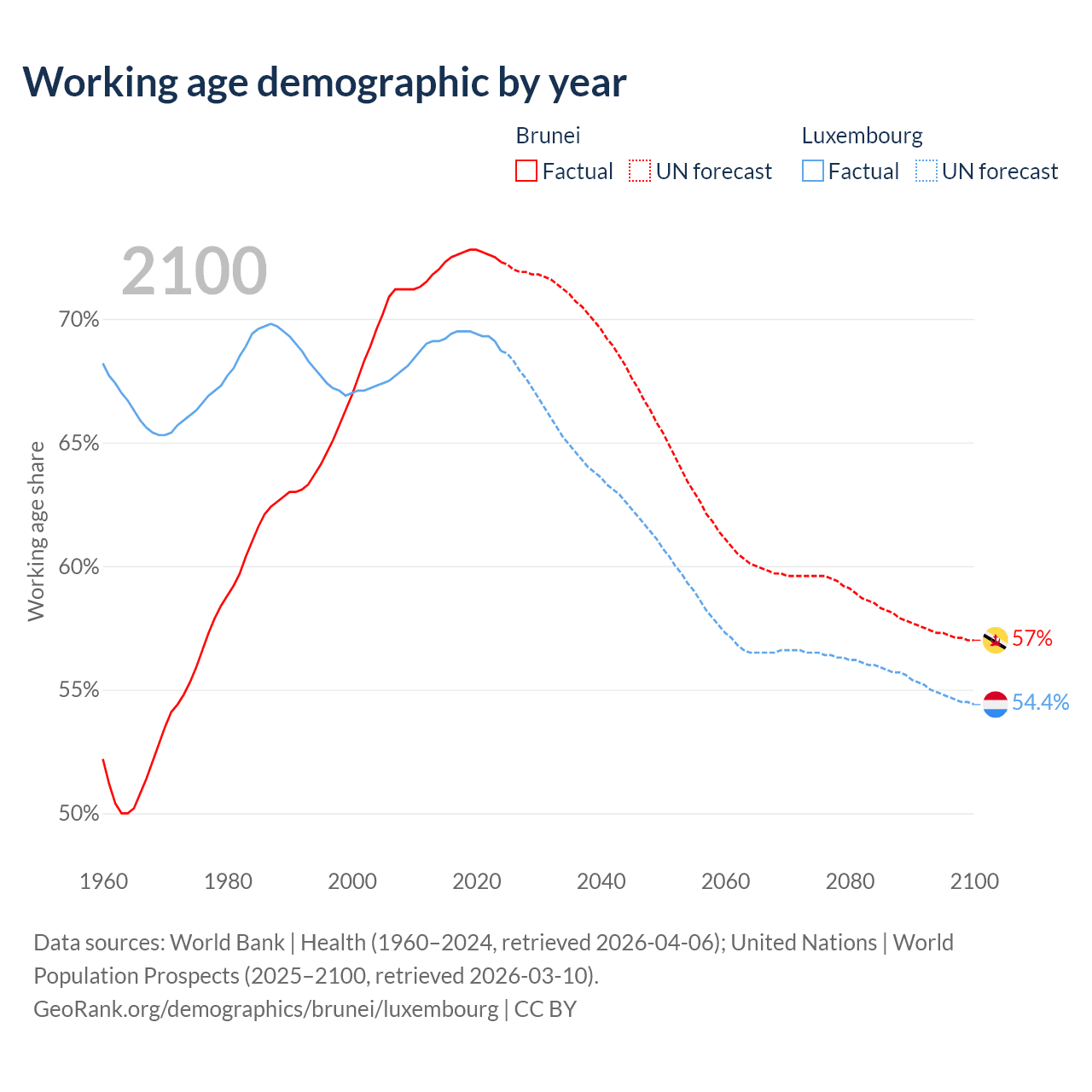 Median age Brunei vs Luxembourg, 1960-2100