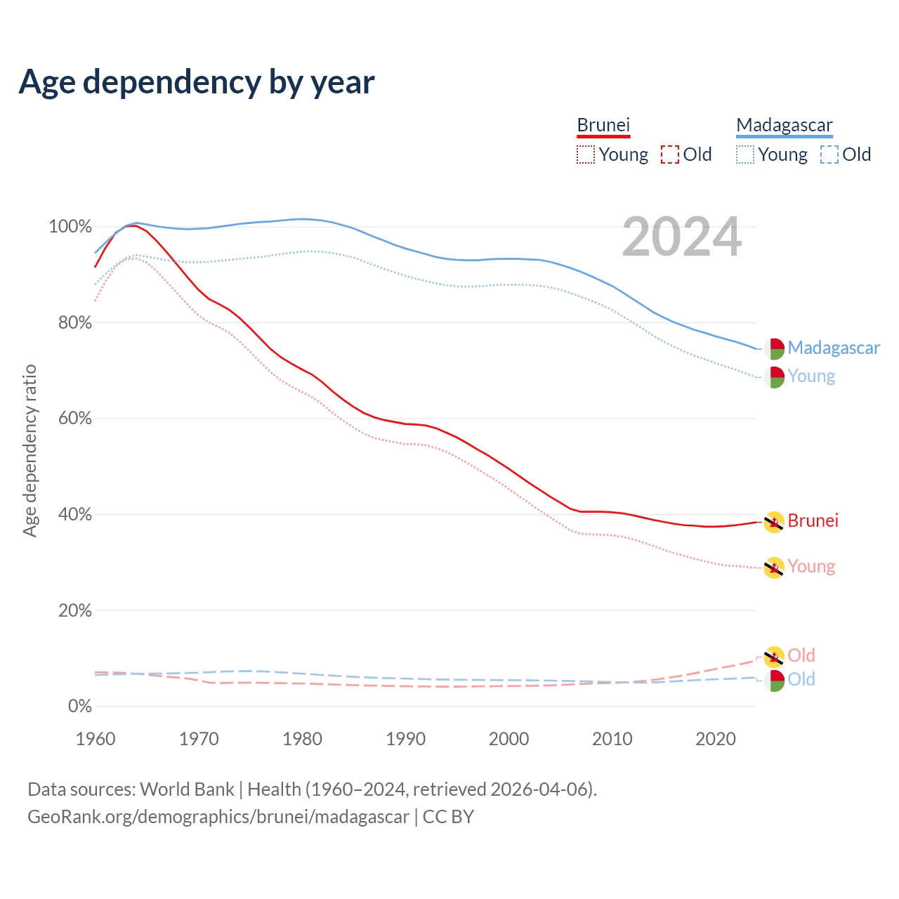 - The share of old-age demographic (65+) in Brunei is 6.87% vs 3.41% in Madagascar.