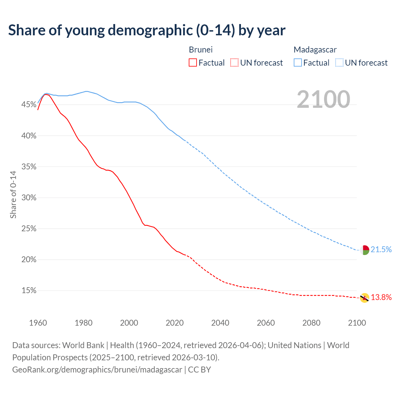 - The share of young demographic (0-15 years old) in Brunei is 20.8% vs 39.3% in Madagascar.
