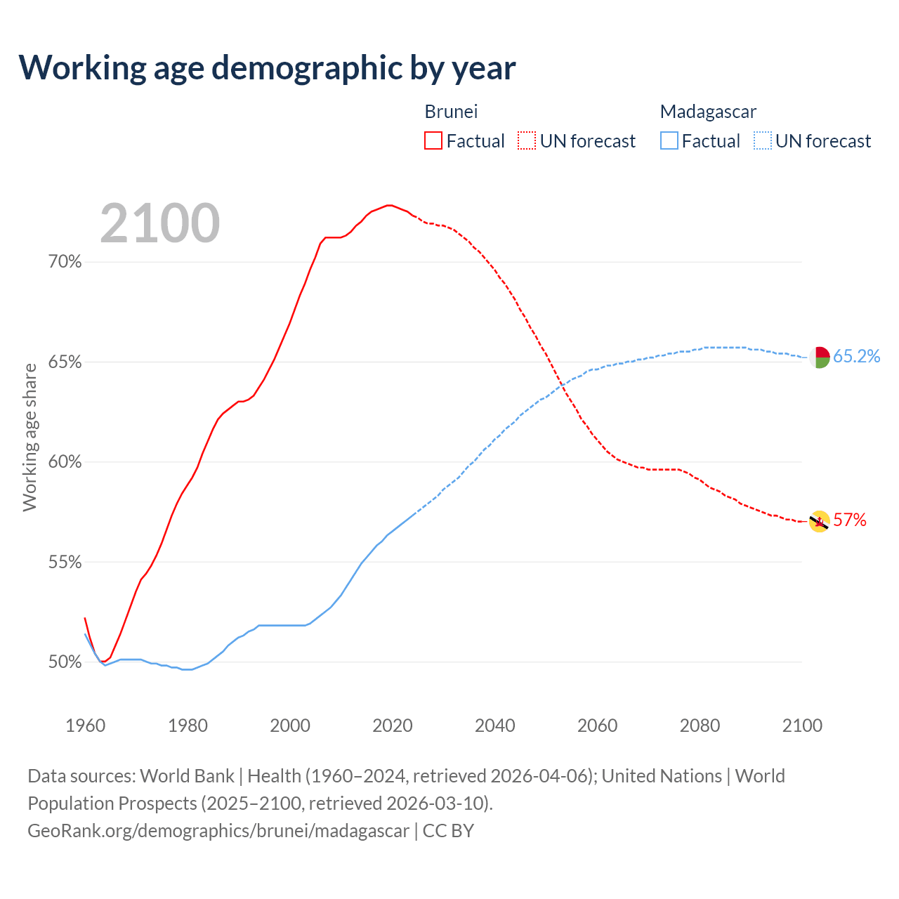 - Brunei has 340K working age adults (aged 15-64) vs 19.4M in Madagascar.