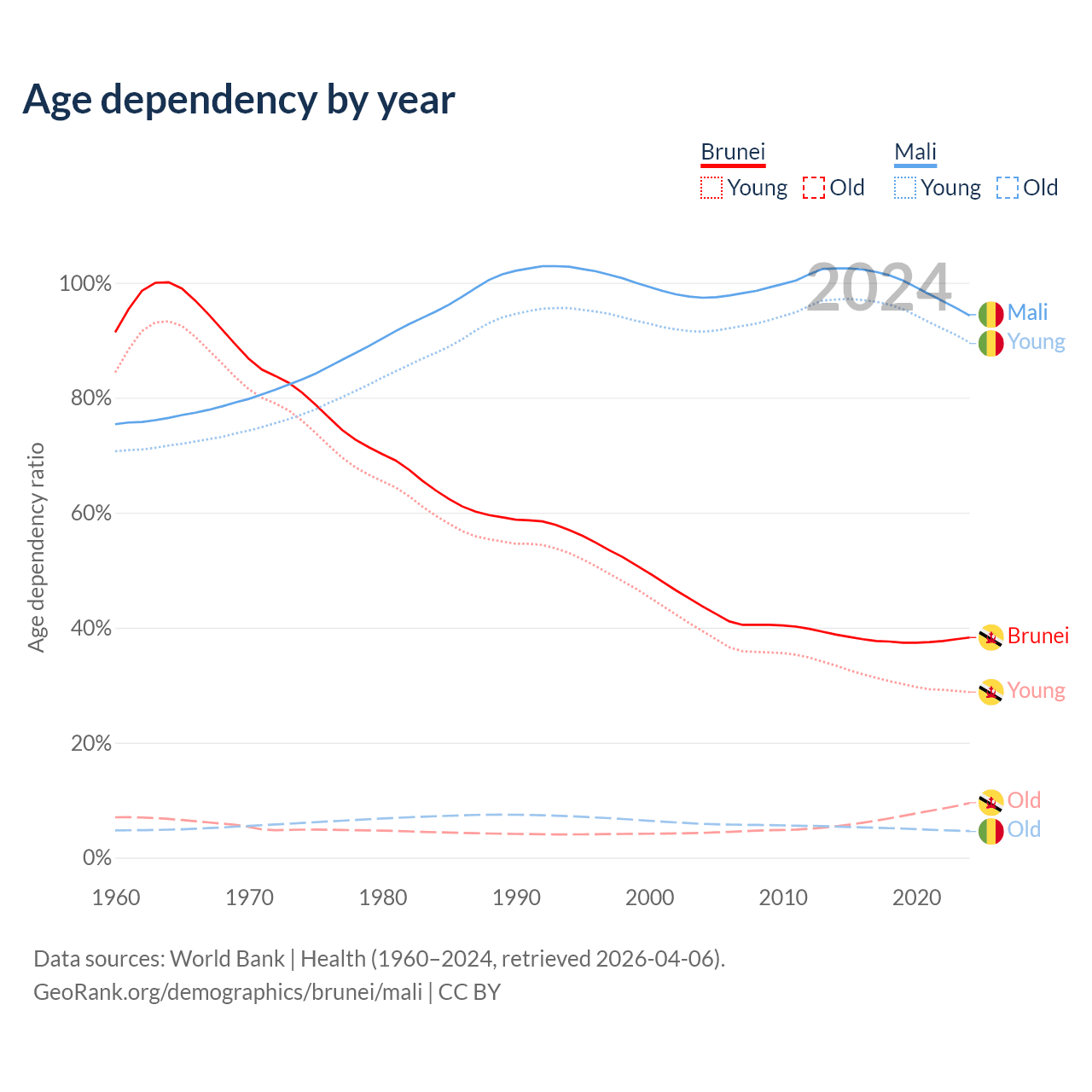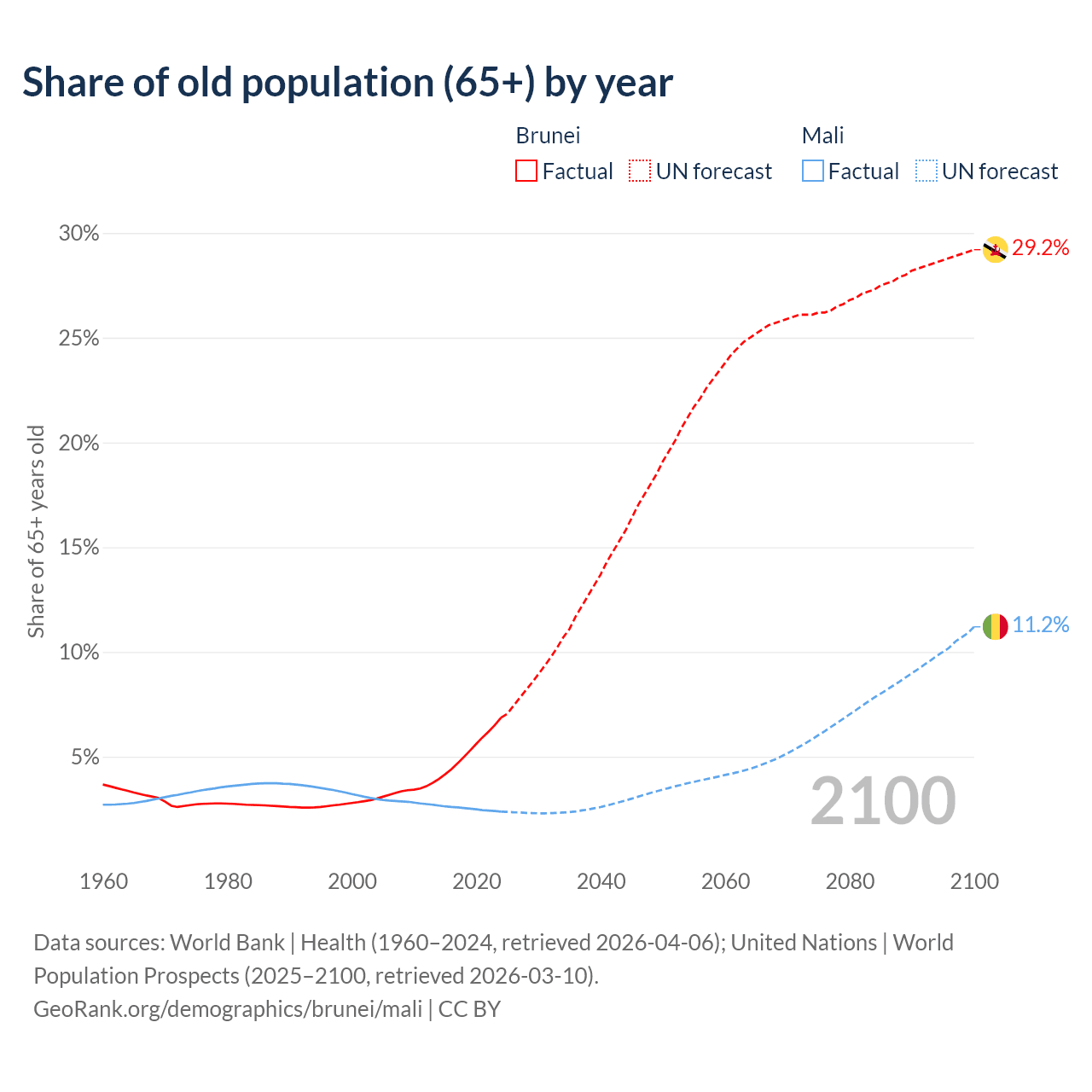 - The share of old-age demographic (65+) in Brunei is 6.87% vs 2.38% in Mali.